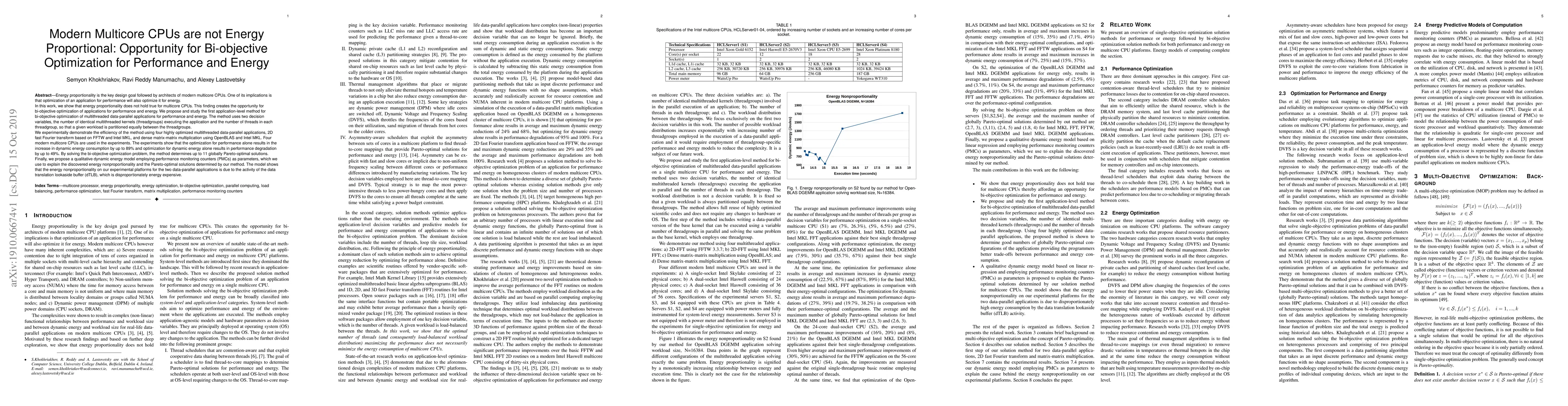 This paper demonstrates that modern multicore CPUs do not adhere to energy proportionality, revealing the need for bi-objective optimization for both performance and energy. The proposed method identifies up to 11 globally Pareto-optimal solutions for multithreaded data-parallel applications, highlighting the inefficiency of optimizing for either performance or energy alone.