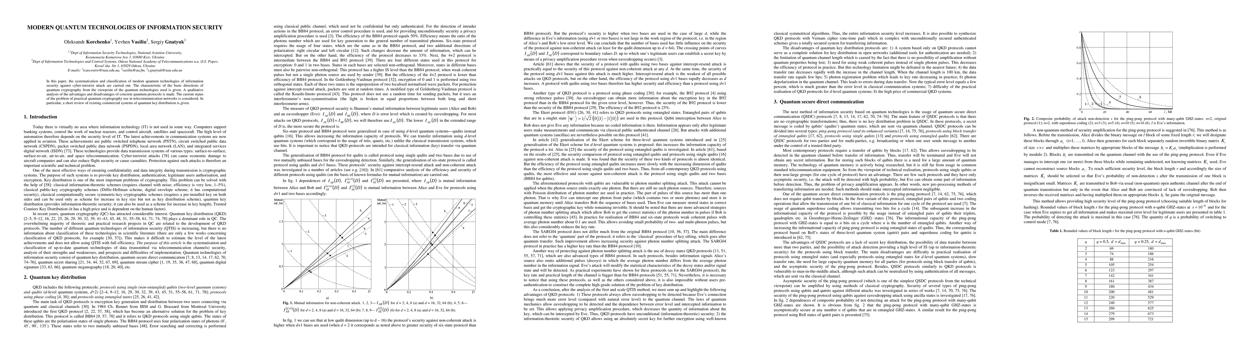 In this paper, the systematisation and classification of modern quantum technologies of information security against cyber-terrorist attack are carried out. The characteristic of the basic directions of quantum cryptography from the viewpoint of the quantum technologies used is given. A qualitative analysis of the advantages and disadvantages of concrete quantum protocols is made. The current status of the problem of practical quantum cryptography use in telecommunication networks is considered. In particular, a short review of existing commercial systems of quantum key distribution is given.