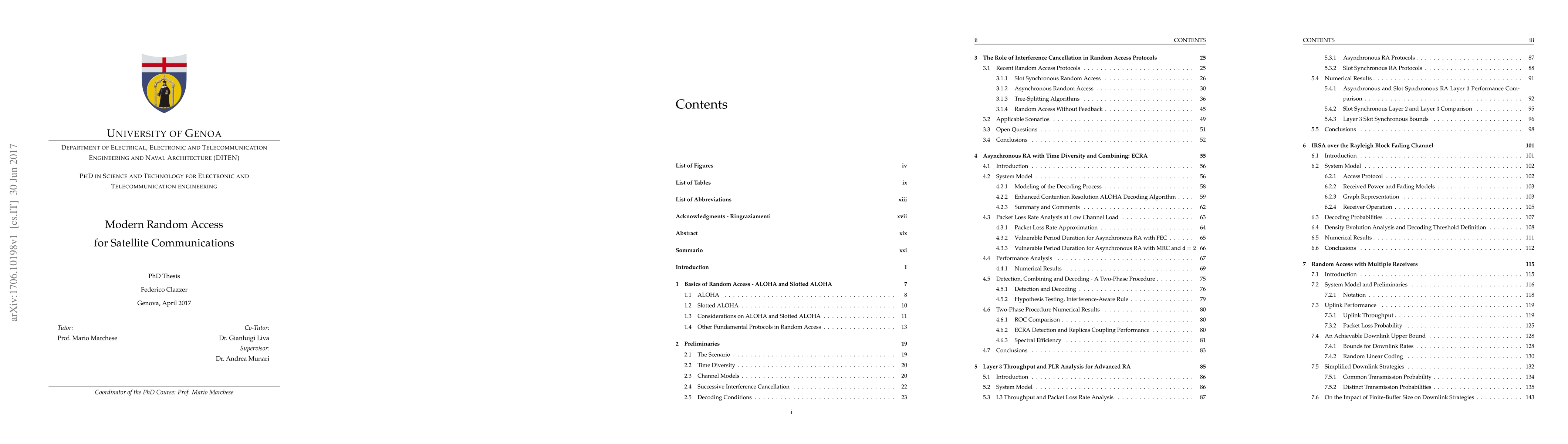 The present PhD dissertation focuses on modern random access (RA) techniques. In the first part an slot- and frame-asynchronous RA scheme adopting replicas, successive interference cancellation and combining techniques is presented and its performance analysed. The comparison of both slot-synchronous and asynchronous RA at higher layer, follows. Next, the optimization procedure, for slot-synchronous RA with irregular repetitions, is extended to the Rayleigh block fading channel. Finally, random access with multiple receivers is considered.