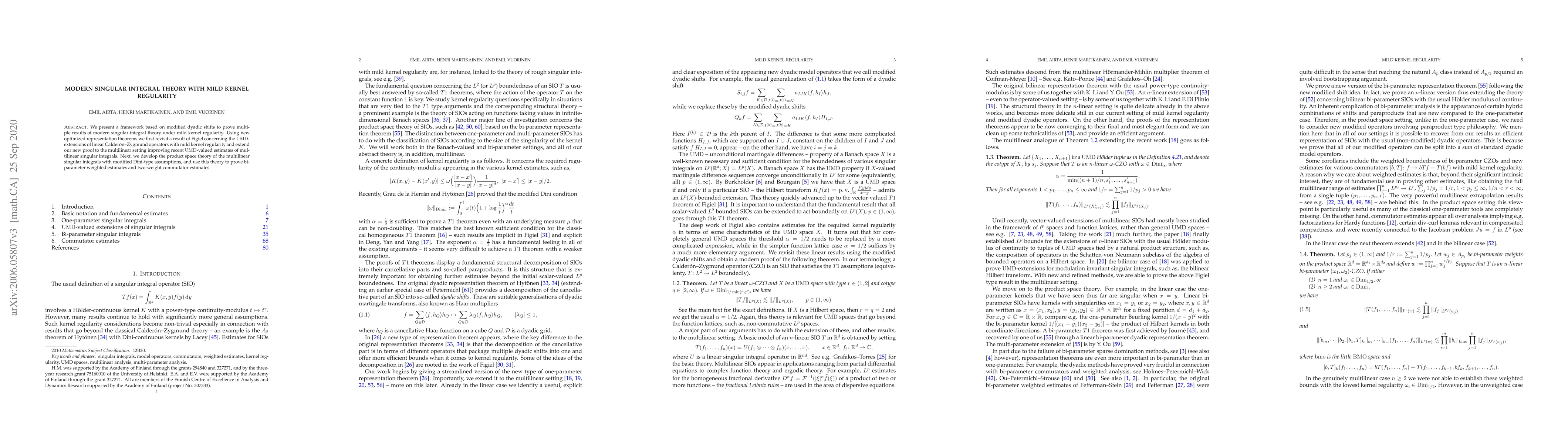 We present a framework based on modified dyadic shifts to prove multiple results of modern singular integral theory under mild kernel regularity. Using new optimized representation theorems we first revisit a result of Figiel concerning the UMD-extensions of linear Calder\'on-Zygmund operators with mild kernel regularity and extend our new proof to the multilinear setting improving recent UMD-valued estimates of multilinear singular integrals. Next, we develop the product space theory of the multilinear singular integrals with modified Dini-type assumptions, and use this theory to prove bi-parameter weighted estimates and two-weight commutator estimates.