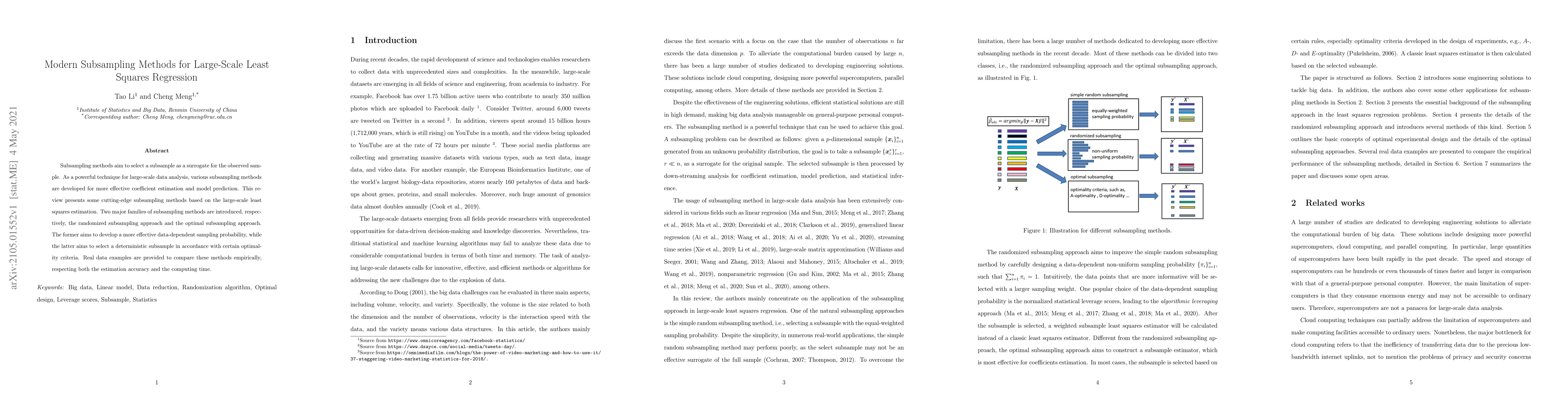 Subsampling methods aim to select a subsample as a surrogate for the observed sample. As a powerful technique for large-scale data analysis, various subsampling methods are developed for more effective coefficient estimation and model prediction. This review presents some cutting-edge subsampling methods based on the large-scale least squares estimation. Two major families of subsampling methods are introduced, respectively, the randomized subsampling approach and the optimal subsampling approach. The former aims to develop a more effective data-dependent sampling probability, while the latter aims to select a deterministic subsample in accordance with certain optimality criteria. Real data examples are provided to compare these methods empirically, respecting both the estimation accuracy and the computing time.