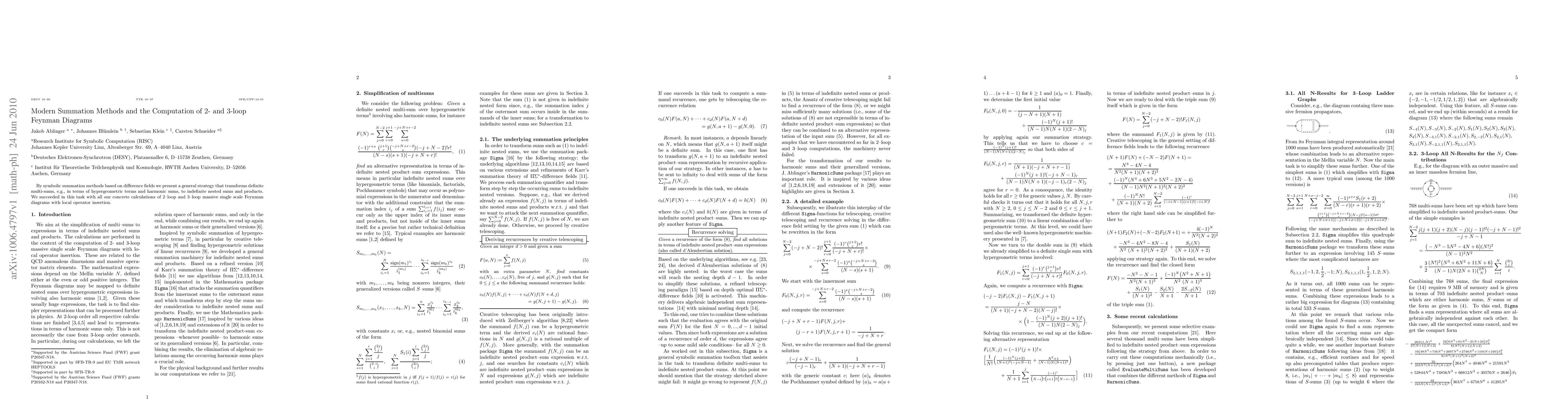 This paper introduces a symbolic summation method for computing 2- and 3-loop Feynman diagrams using difference fields, transforming definite multi-sums into indefinite nested sums and products. The method successfully applies to massive single scale Feynman diagrams with local operator insertions.
