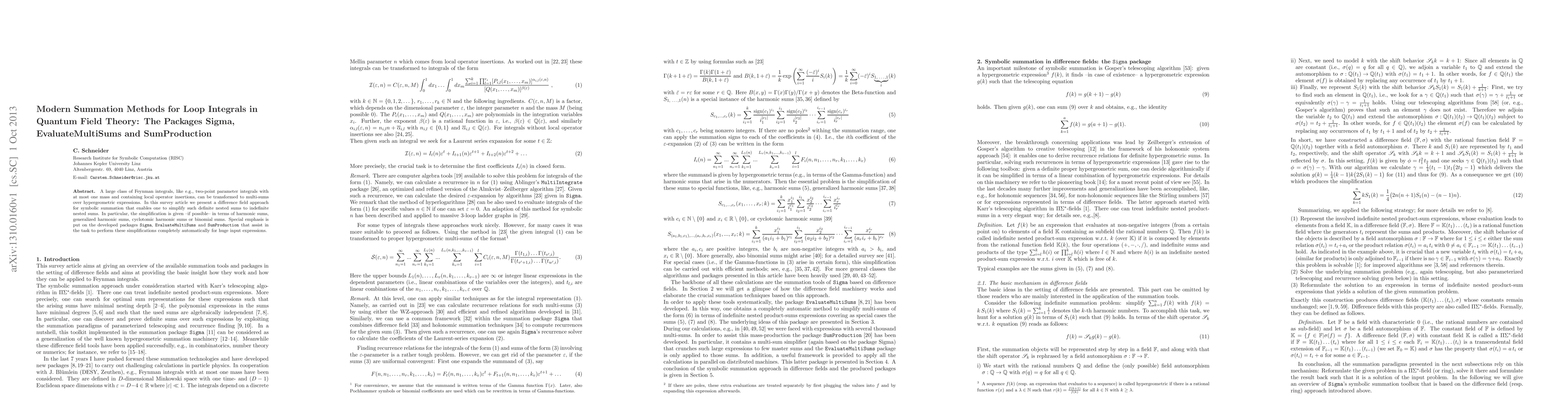A large class of Feynman integrals, like e.g., two-point parameter integrals with at most one mass and containing local operator insertions, can be transformed to multi-sums over hypergeometric expressions. In this survey article we present a difference field approach for symbolic summation that enables one to simplify such definite nested sums to indefinite nested sums. In particular, the simplification is given -if possible- in terms of harmonic sums, generalized harmonic sums, cyclotomic harmonic sums or binomial sums. Special emphasis is put on the developed packages Sigma, EvaluateMultiSums and SumProduction that assist in the task to perform these simplifications completely automatically for huge input expressions.