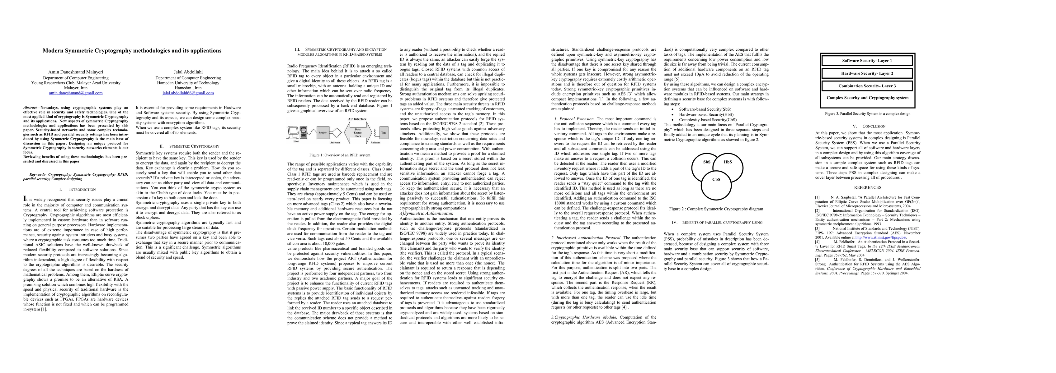 This work is novel as it combines symmetric cryptography with RFID systems to provide secure authentication protocols, addressing the major security threats in RFID systems, and proposes a parallel security system (PSS) for complex designs.