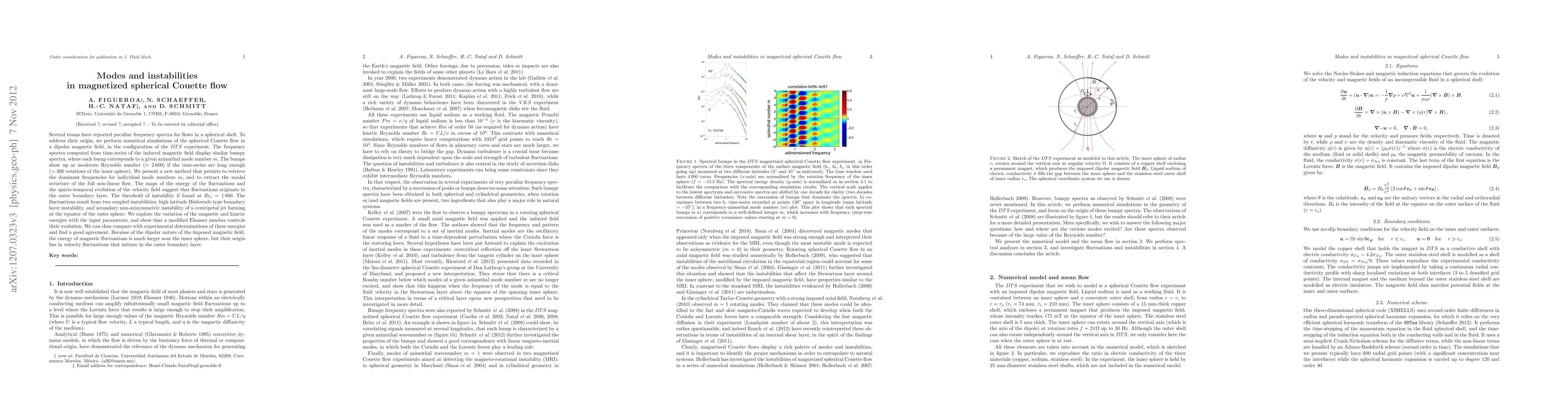 Several teams have reported peculiar frequency spectra for flows in a spherical shell. To address their origin, we perform numerical simulations of the spherical Couette flow in a dipolar magnetic field, in the configuration of the DTS experiment. The frequency spectra computed from time-series of the induced magnetic field display similar bumpy spectra, where each bump corresponds to a given azimuthal mode number m. The bumps show up at moderate Reynolds number (2 600) if the time-series are long enough (>300 rotations of the inner sphere). We present a new method that permits to retrieve the dominant frequencies for individual mode numbers m, and to extract the modal structure of the full non-linear flow. The maps of the energy of the fluctuations and the spatio-temporal evolution of the velocity field suggest that fluctuations originate in the outer boundary layer. The threshold of instability if found at Re_c = 1 860. The fluctuations result from two coupled instabilities: high latitude B\"odewadt-type boundary layer instability, and secondary non-axisymmetric instability of a centripetal jet forming at the equator of the outer sphere. We explore the variation of the magnetic and kinetic energies with the input parameters, and show that a modified Elsasser number controls their evolution. We can thus compare with experimental determinations of these energies and find a good agreement. Because of the dipolar nature of the imposed magnetic field, the energy of magnetic fluctuations is much larger near the inner sphere, but their origin lies in velocity fluctuations that initiate in the outer boundary layer.
