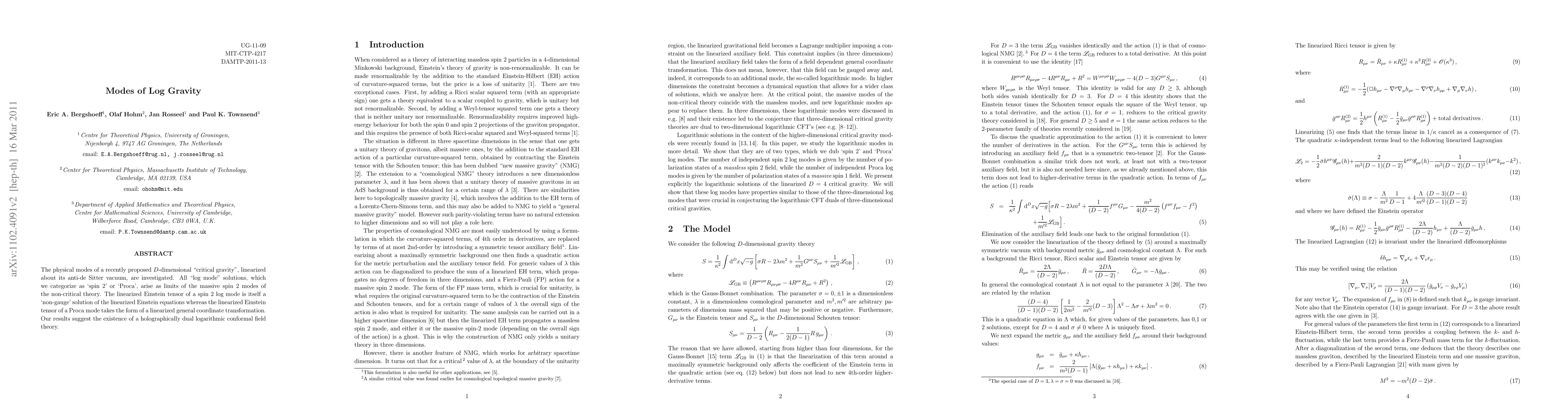The physical modes of a recently proposed D-dimensional "critical gravity", linearized about its anti-de Sitter vacuum, are investigated. All "log mode" solutions, which we categorize as `spin 2' or `Proca', arise as limits of the massive spin 2 modes of the non-critical theory. The linearized Einstein tensor of a spin 2 log mode is itself a 'non-gauge' solution of the linearized Einstein equations whereas the linearized Einstein tensor of a Proca mode takes the form of a linearized general coordinate transformation. Our results suggest the existence of a holographically dual logarithmic conformal field theory.