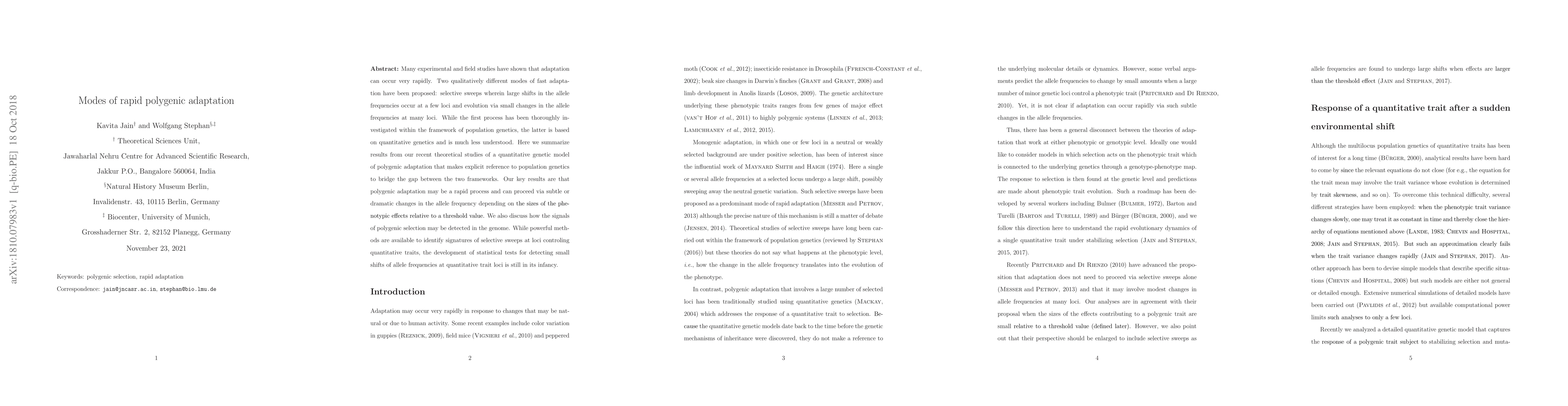 Many experimental and field studies have shown that adaptation can occur very rapidly. Two qualitatively different modes of fast adaptation have been proposed: selective sweeps wherein large shifts in the allele frequencies occur at a few loci and evolution via small changes in the allele frequencies at many loci. While the first process has been thoroughly investigated within the framework of population genetics, the latter is based on quantitative genetics and is much less understood. Here we summarize results from our recent theoretical studies of a quantitative genetic model of polygenic adaptation that makes explicit reference to population genetics to bridge the gap between the two frameworks. Our key results are that polygenic adaptation may be a rapid process and can proceed via subtle or dramatic changes in the allele frequency depending on the sizes of the phenotypic effects relative to a threshold value. We also discuss how the signals of polygenic selection may be detected in the genome. While powerful methods are available to identify signatures of selective sweeps at loci controling quantitative traits, the development of statistical tests for detecting small shifts of allele frequencies at quantitative trait loci is still in its infancy.