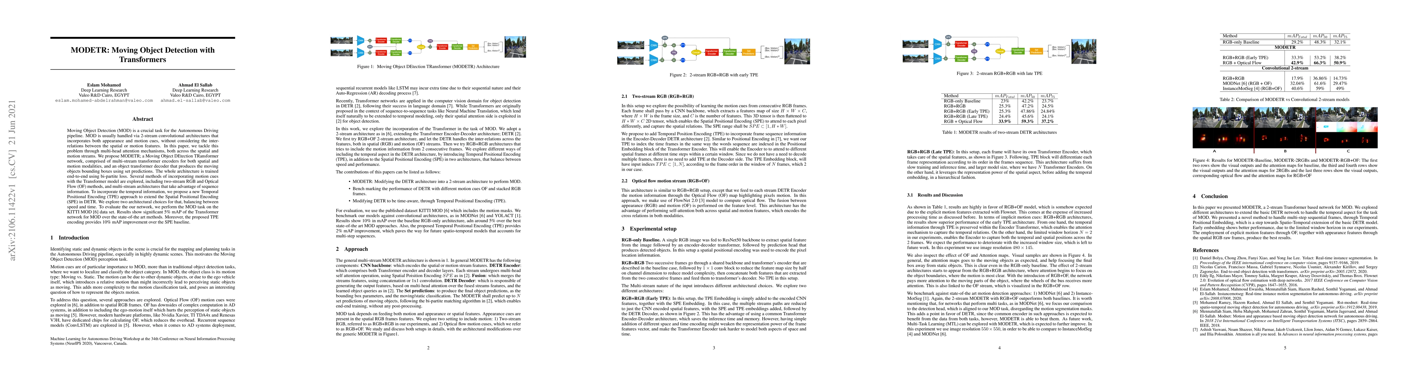 Moving Object Detection (MOD) is a crucial task for the Autonomous Driving pipeline. MOD is usually handled via 2-stream convolutional architectures that incorporates both appearance and motion cues, without considering the inter-relations between the spatial or motion features. In this paper, we tackle this problem through multi-head attention mechanisms, both across the spatial and motion streams. We propose MODETR; a Moving Object DEtection TRansformer network, comprised of multi-stream transformer encoders for both spatial and motion modalities, and an object transformer decoder that produces the moving objects bounding boxes using set predictions. The whole architecture is trained end-to-end using bi-partite loss. Several methods of incorporating motion cues with the Transformer model are explored, including two-stream RGB and Optical Flow (OF) methods, and multi-stream architectures that take advantage of sequence information. To incorporate the temporal information, we propose a new Temporal Positional Encoding (TPE) approach to extend the Spatial Positional Encoding(SPE) in DETR. We explore two architectural choices for that, balancing between speed and time. To evaluate the our network, we perform the MOD task on the KITTI MOD [6] data set. Results show significant 5% mAP of the Transformer network for MOD over the state-of-the art methods. Moreover, the proposed TPE encoding provides 10% mAP improvement over the SPE baseline.