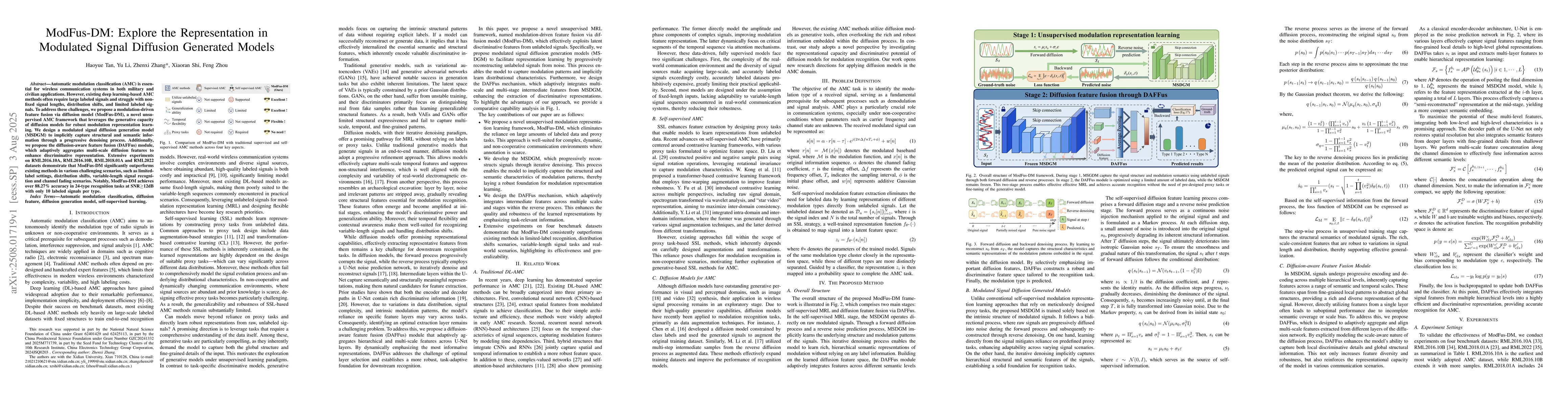 Automatic modulation classification (AMC) is essential for wireless communication systems in both military and civilian applications. However, existing deep learning-based AMC methods often require large labeled signals and struggle with non-fixed signal lengths, distribution shifts, and limited labeled signals. To address these challenges, we propose a modulation-driven feature fusion via diffusion model (ModFus-DM), a novel unsupervised AMC framework that leverages the generative capacity of diffusion models for robust modulation representation learning. We design a modulated signal diffusion generation model (MSDGM) to implicitly capture structural and semantic information through a progressive denoising process. Additionally, we propose the diffusion-aware feature fusion (DAFFus) module, which adaptively aggregates multi-scale diffusion features to enhance discriminative representation. Extensive experiments on RML2016.10A, RML2016.10B, RML2018.01A and RML2022 datasets demonstrate that ModFus-DM significantly outperforms existing methods in various challenging scenarios, such as limited-label settings, distribution shifts, variable-length signal recognition and channel fading scenarios. Notably, ModFus-DM achieves over 88.27% accuracy in 24-type recognition tasks at SNR $\geq $ 12dB with only 10 labeled signals per type.