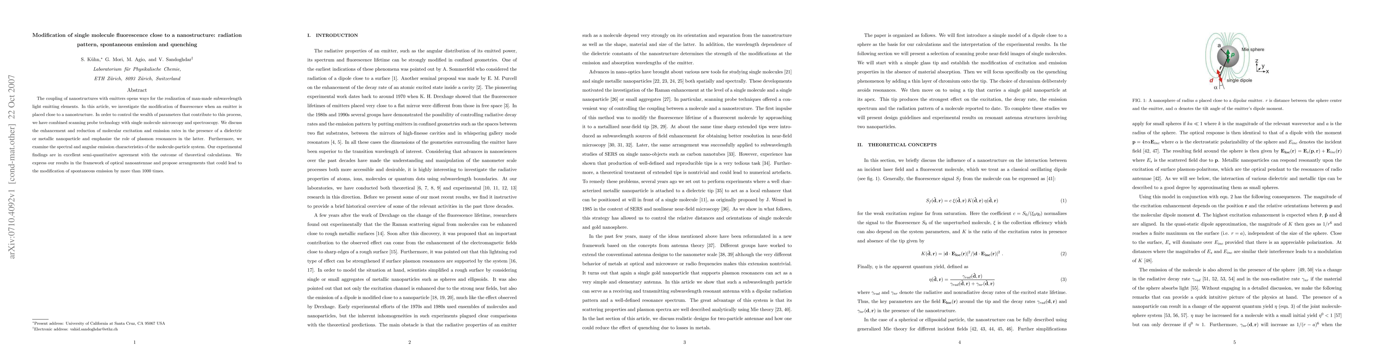 This paper explores how fluorescence from single molecules is altered when positioned near nanostructures, focusing on the enhancement or quenching of emission rates and the influence of plasmon resonances. The study combines advanced microscopy and theoretical models to propose nanoantenna arrangements that could amplify spontaneous emission by over 1000 times.