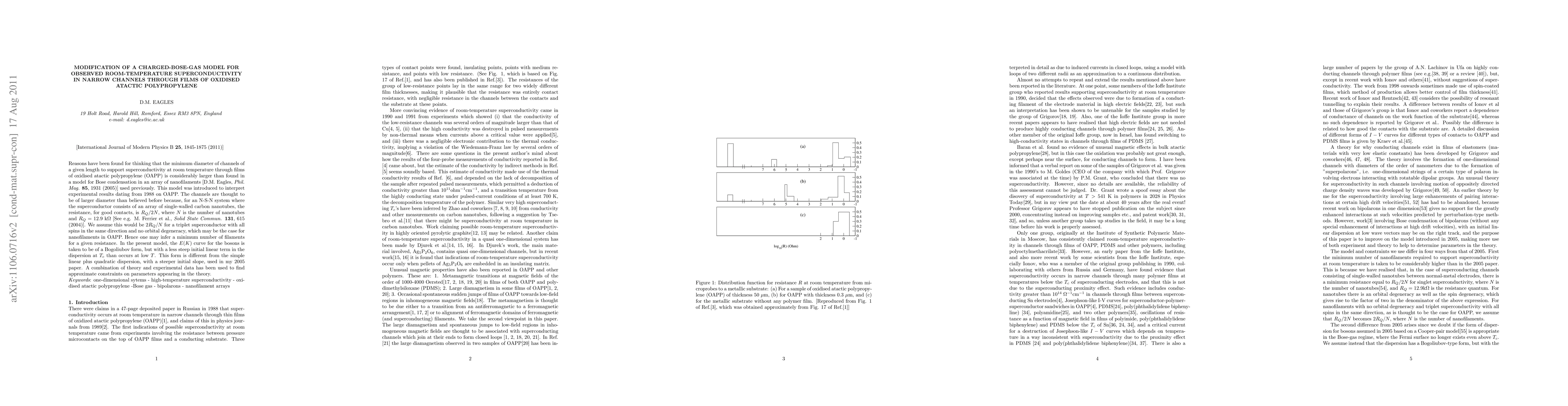 Reasons have been found for thinking that the minimum diameter of channels of a given length to support superconductivity at room temperature through films of oxidised atactic polypropylene (OAPP) is considerably larger than found in a model for Bose condensation in an array of nanofilaments [D.M. Eagles, Phil. Mag. 85, 1931 (2005)] used previously. This model was introduced to interpret experimental results dating from 1988 on OAPP. The channels are thought to be of larger diameter than believed before because, for an N-S-N system where the superconductor consists of an array of single-walled carbon nanotubes, the resistance, for good contacts, is R_Q/2N, where N is the number of nanotubes and R_Q=12.9 kOhm [See e.g. M. Ferrier et al., Solid State Commun. 131, 615 (2004)]. We assume this would be 2R_Q/N for a triplet superconductor with all spins in the same direction and no orbital degeneracy, which may be the case for nanofilaments in OAPP. Hence one may infer a minimum number of filaments for a given resistance. In the present model, the E(K) curve for the bosons is taken to be of a Bogoliubov form, but with a less steep initial linear term in the dispersion at T_c than occurs at low T. This form is different from the simple linear plus quadratic dispersion, with a steeper initial slope, used in my 2005 paper. A combination of theory and experimental data has been used to find approximate constraints on parameters appearing in the theory.