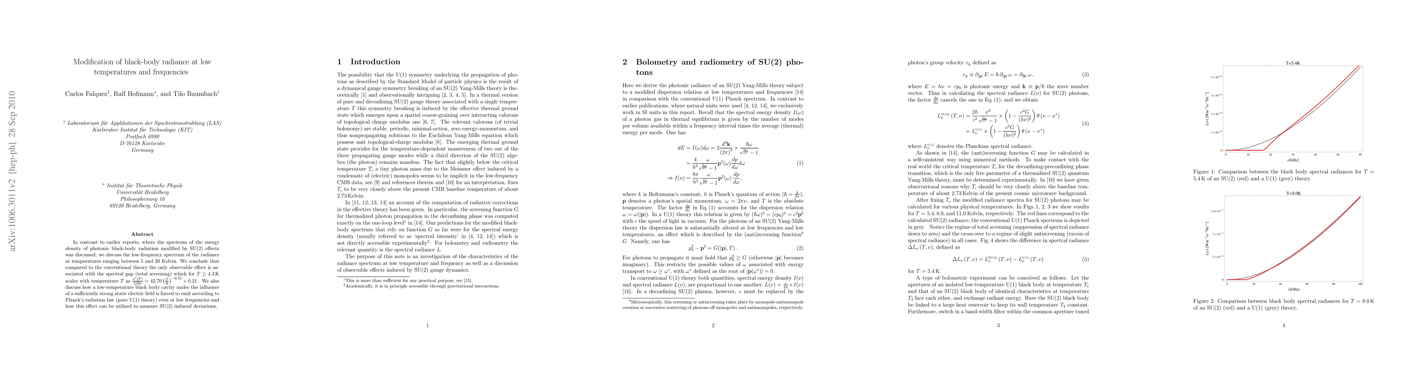In contrast to earlier reports, where the spectrum of the {\sl energy density} of photonic black-body radiation modified by SU(2) effects was discussed, we discuss the low-frequency spectrum of the {\sl radiance} at temperatures ranging between 5 and 20 Kelvin. We conclude that compared to the conventional theory the only observable effect is associated with the spectral gap (total screening). We also discuss how a low-temperature black body cavity under the influence of a sufficiently strong static electric field is forced to emit according to Planck's radiation law (pure U(1) theory) even at low frequencies and how this effect can be utilized to measure SU(2) induced deviations.