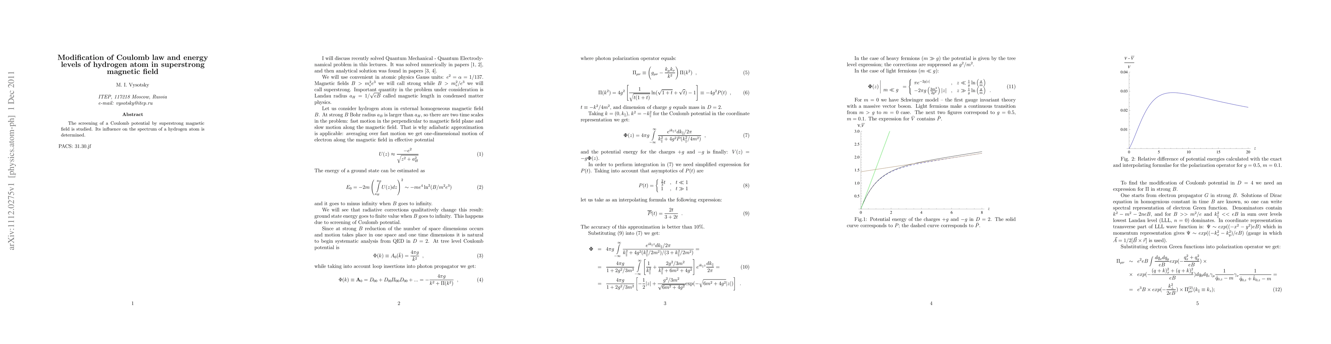 The screening of a Coulomb potential by superstrong magnetic field is studied. Its influence on the spectrum of a hydrogen atom is determined.