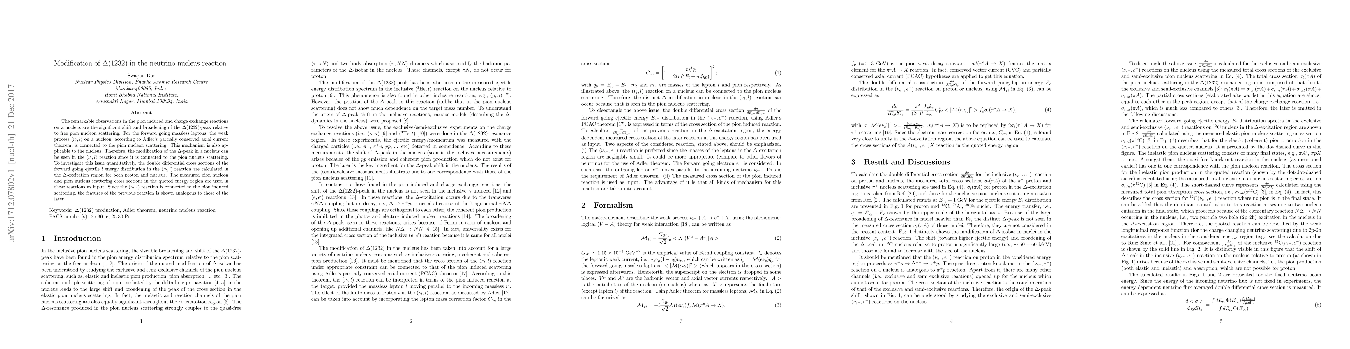 The remarkable observations in the pion induced and charge exchange reactions on a nucleus are the significant shift and broadening of the $\Delta (1232)$-peak relative to free pion nucleon scattering. For the forward going massless leptons, the weak process $(\nu_l,l)$ on a nucleon, according to Adler's partially conserved axial current theorem, is connected to the pion nucleon scattering. This mechanism is also applicable to the nucleus. Therefore, the modification of the $\Delta$-peak in a nucleus can be seen in the $(\nu_l,l)$ reaction since it is connected to the pion nucleus scattering. To investigate this issue quantitatively, the double differential cross sections of the forward going ejectile $l$ energy distribution in the $(\nu_l,l)$ reaction are calculated in the $\Delta$-excitation region for both proton and nucleus. The measured pion nucleon and pion nucleus scattering cross sections in the quoted energy region are used in these reactions as input. Since the $(\nu_l,l)$ reaction is connected to the pion induced scattering, the features of the previous reaction is shown analogous to those of the later.