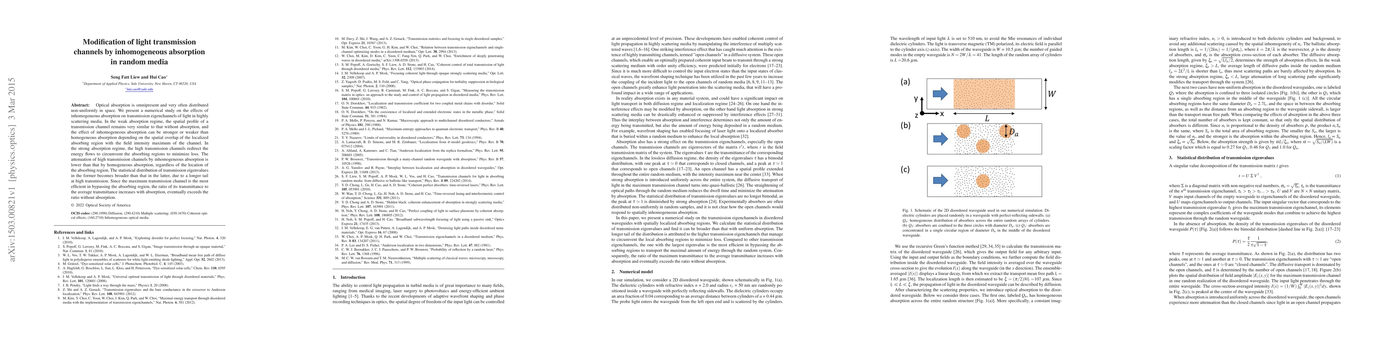 This paper explores how inhomogeneous absorption affects light transmission channels in random media, finding that weak absorption maintains similar spatial profiles to non-absorbing channels, while strong absorption redirects energy to minimize losses, resulting in broader statistical distributions of transmission eigenvalues and higher efficiency of the maximum transmission channel.