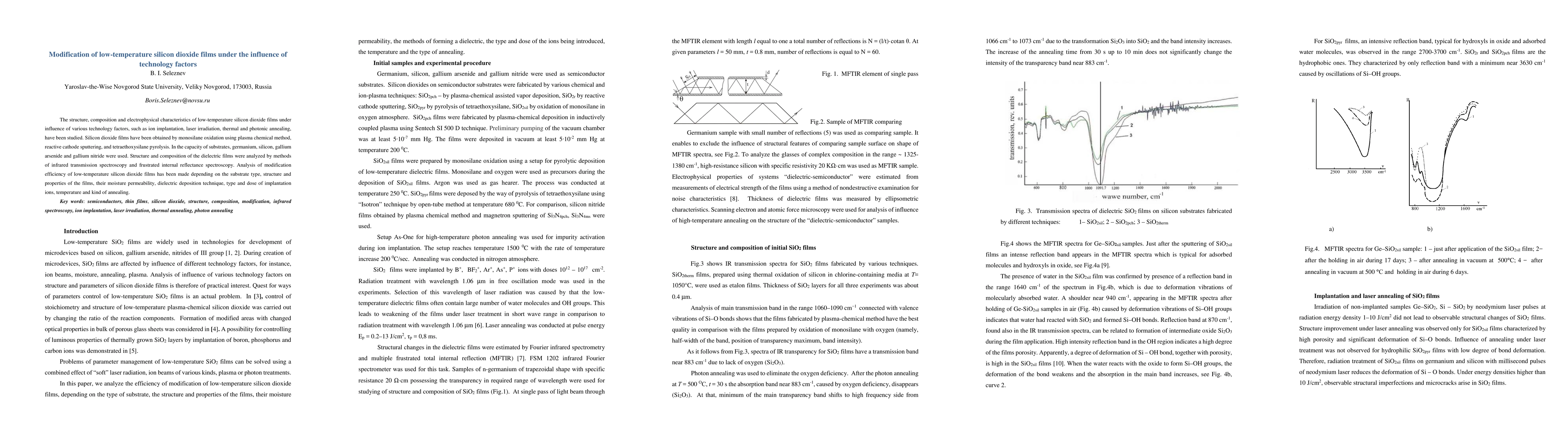 This study investigates the structural, compositional, and electrophysical modifications of low-temperature silicon dioxide films influenced by various technology factors, including ion implantation, laser irradiation, and different annealing methods. The films were deposited using diverse techniques and analyzed for efficiency based on substrate type and film properties.