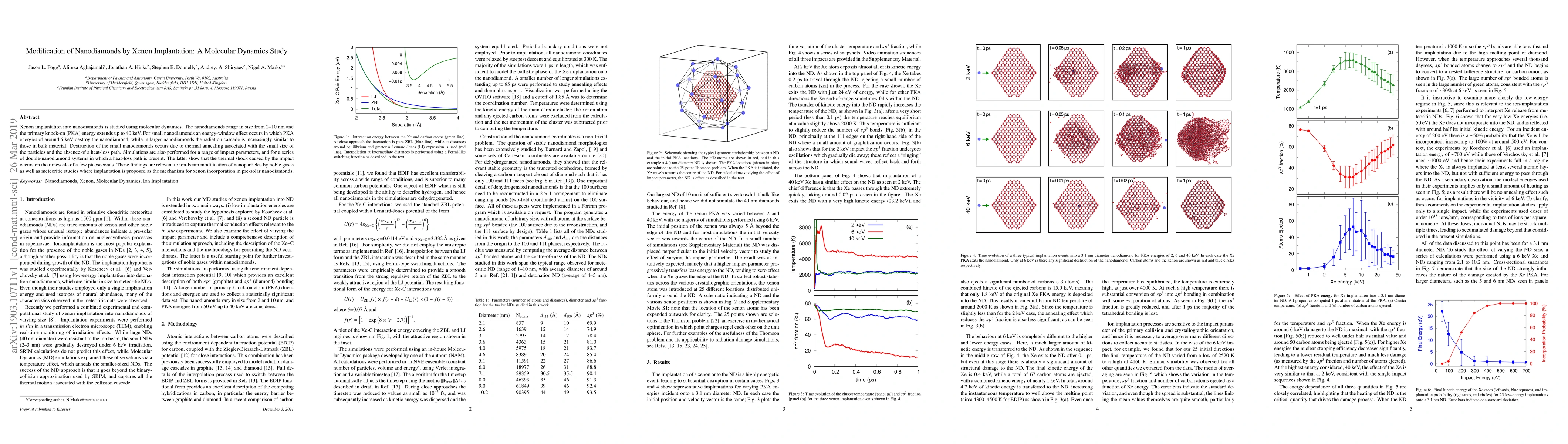 Summary: This study investigates xenon implantation into nanodiamonds of 2-10 nm using molecular dynamics, revealing that small nanodiamonds are destroyed at PKA energies around 6 keV due to thermal annealing, while larger ones show radiation cascades similar to bulk material. Simulations of double-nanodiamond systems indicate rapid thermal shock effects on picosecond timescales.