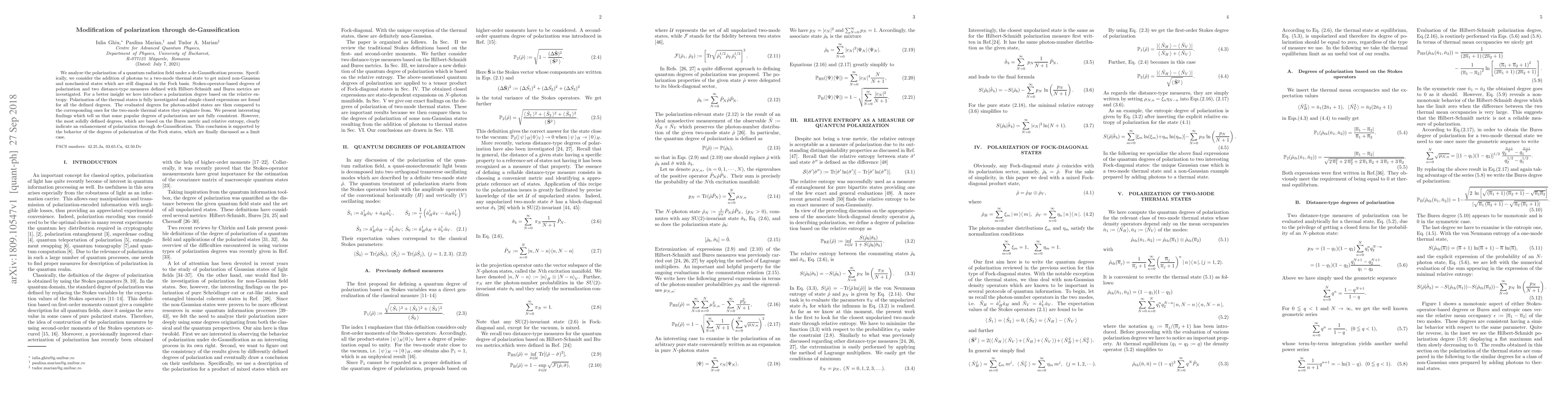 We analyze the polarization of a quantum radiation field under a de-Gaussification process. Specifically, we consider the addition of photons to a two-mode thermal state to get mixed non-Gaussian and nonclassical states which are still diagonal in the Fock basis. Stokes-operator-based degrees of polarization and two distance-type measures defined with Hilbert-Schmidt and Bures metrics are investigated. For a better insight we here introduce a polarization degree based on the relative entropy. Polarization of the thermal states is fully investigated and simple closed expressions are found for all the defined degrees. The evaluated degrees for photon-added states are then compared to the corresponding ones for the two-mode thermal states they originate from. We present interesting findings which tell us that some popular degrees of polarization are not fully consistent. However, the most solidly defined degrees, which are based on the Bures metric and relative entropy, clearly indicate an enhancement of polarization through de-Gaussification. This conclusion is supported by the behavior of the degrees of polarization of the Fock states, which are finally discussed as a limit case.