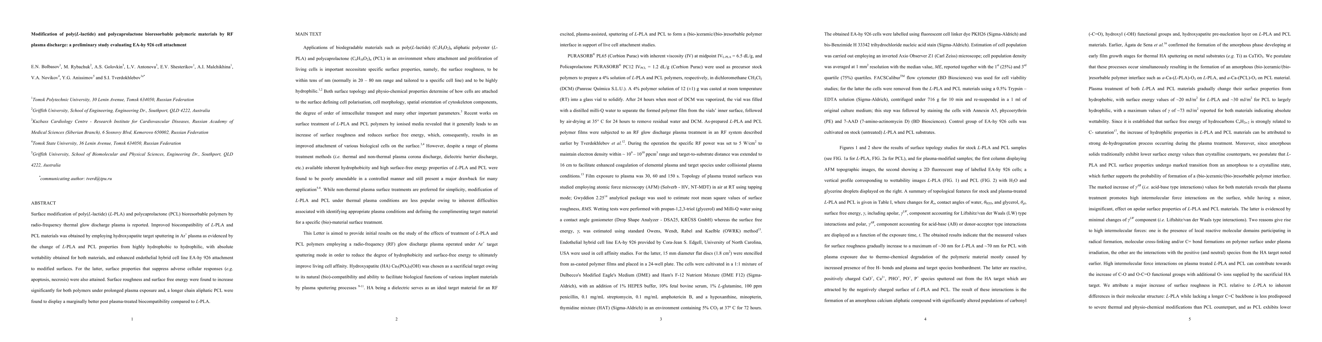 Researchers used RF plasma discharge to modify poly(L-lactide) and polycaprolactone biodegradable polymers, improving their hydrophilicity and enhancing cell attachment in an endothelial hybrid cell line.