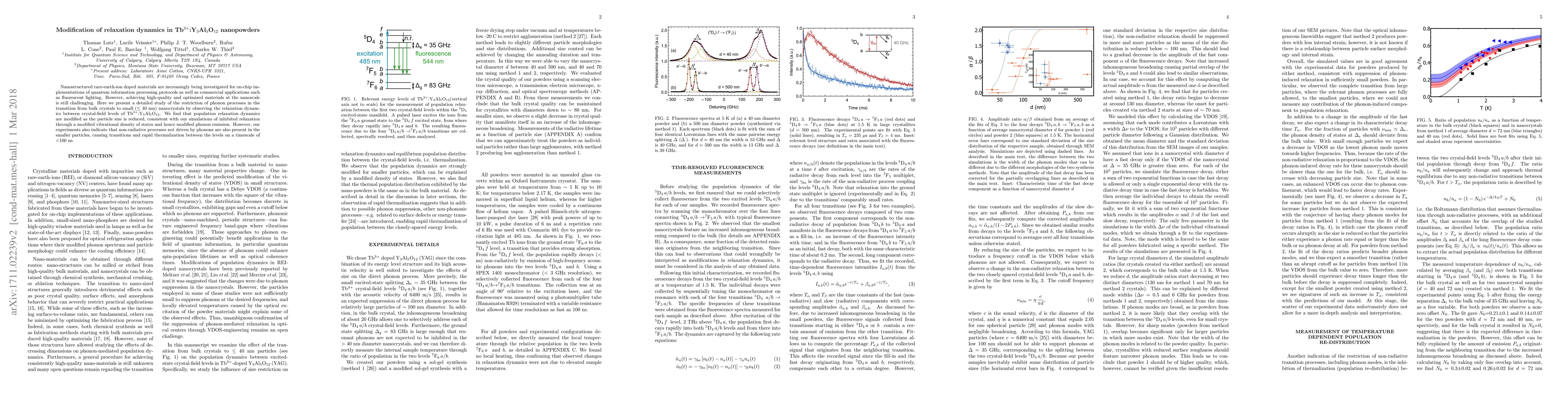Nanostructured rare-earth-ion doped materials are increasingly being investigated for on-chip implementations of quantum information processing protocols as well as commercial applications such as fluorescent lighting. However, achieving high-quality and optimized materials at the nanoscale is still challenging. Here we present a detailed study of the restriction of phonon processes in the transition from bulk crystals to small ($\le$ 40 nm) nanocrystals by observing the relaxation dynamics between crystal-field levels of Tb$^{3+}$:Y$_3$Al$_5$O$_{12}$. We find that population relaxation dynamics are modified as the particle size is reduced, consistent with our simulations of inhibited relaxation through a modified vibrational density of states and hence modified phonon emission. However, our experiments also indicate that non-radiative processes not driven by phonons are also present in the smaller particles, causing transitions and rapid thermalization between the levels on a timescale of $<$100 ns.