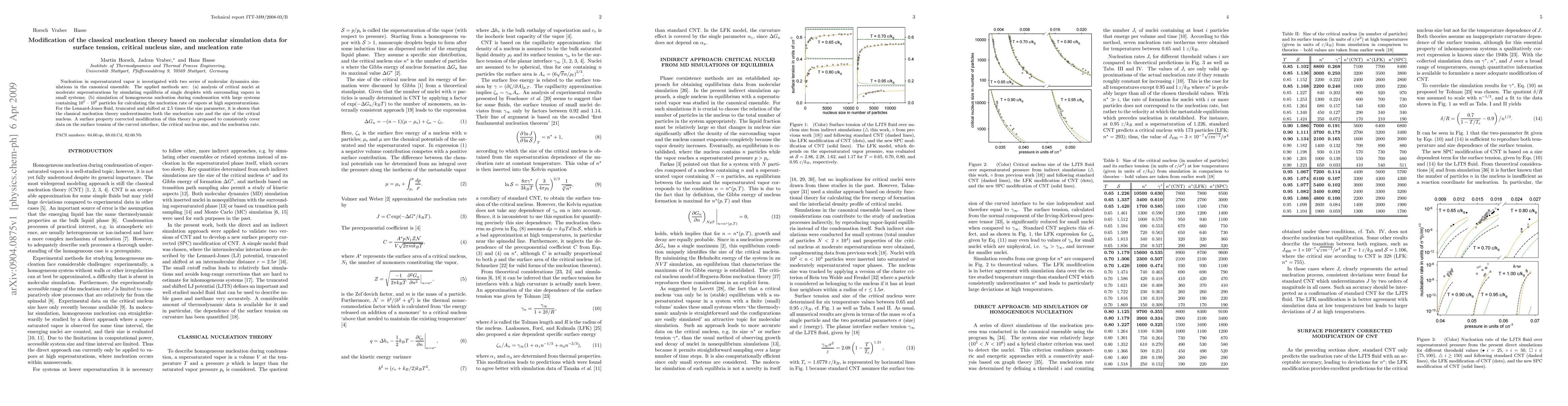 This paper modifies classical nucleation theory using molecular dynamics simulations to better predict nucleation rates and critical nucleus sizes in supersaturated vapors. The study finds that classical theory underestimates these parameters and proposes a corrected model incorporating surface tension data.