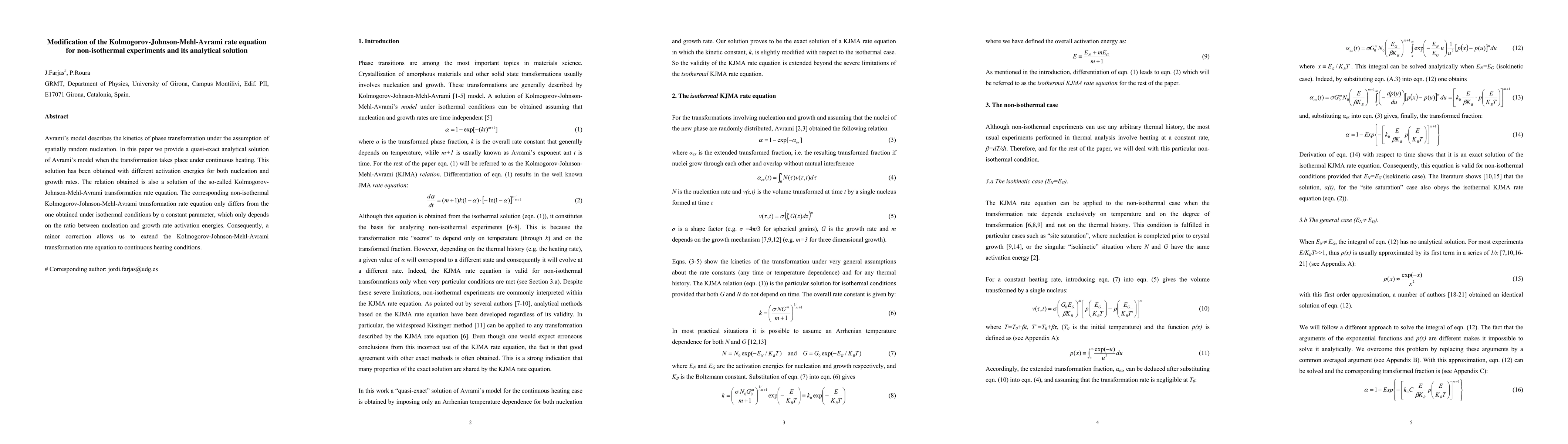 This paper derives a quasi-exact analytical solution for Avrami's model under continuous heating, considering different activation energies for nucleation and growth rates. It modifies the Kolmogorov-Johnson-Mehl-Avrami equation for non-isothermal conditions, introducing a constant parameter based on the ratio of activation energies.