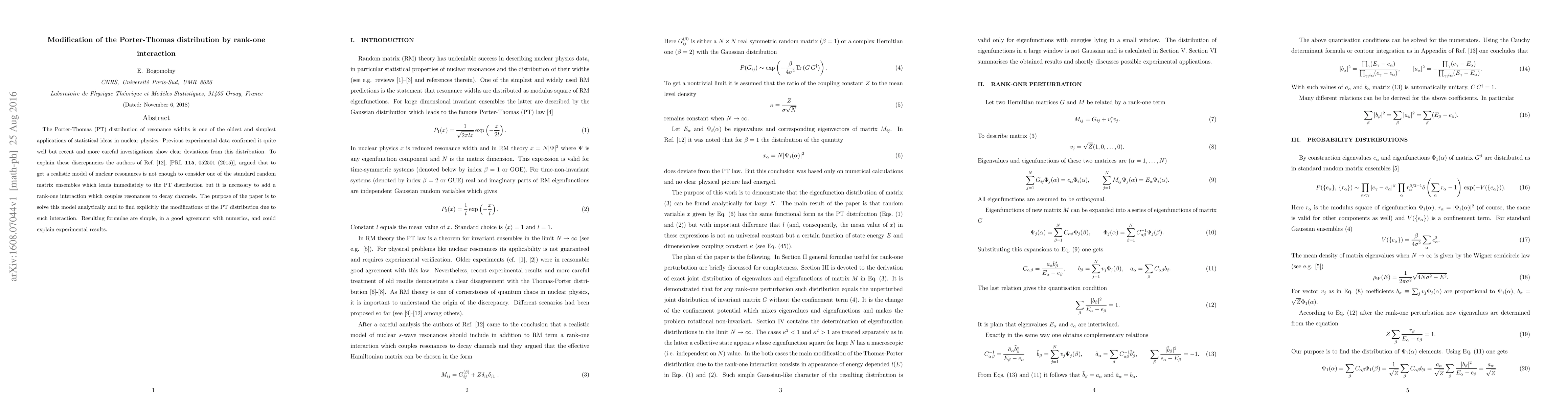This paper analytically modifies the Porter-Thomas distribution by incorporating rank-one interaction, addressing discrepancies in nuclear resonance widths. The resulting formulae, consistent with numerical results, provide a better fit to recent experimental data.