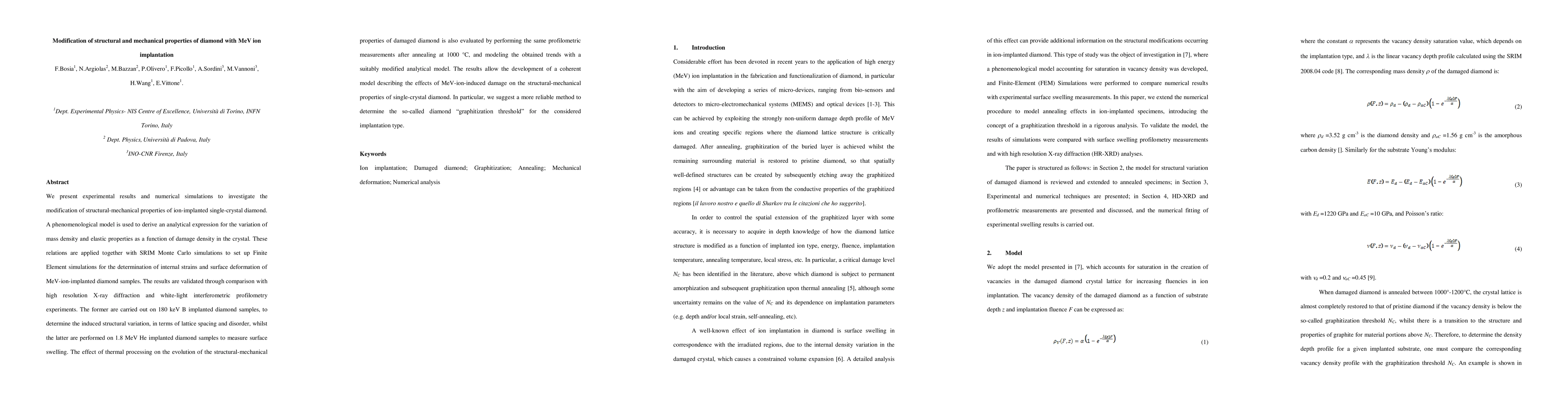This paper investigates the structural-mechanical modifications in single-crystal diamond due to MeV ion implantation, using a combination of analytical models, simulations, and experimental validation. The study proposes a method to determine the diamond "graphitization threshold" for specific implantation types.
