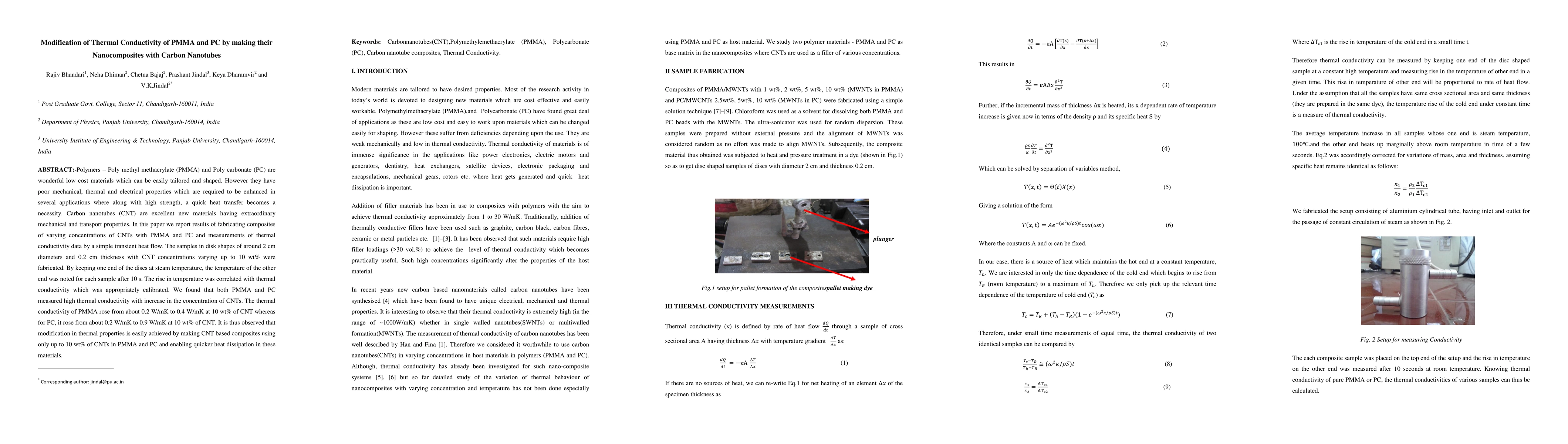 This study investigates the enhancement of thermal conductivity in PMMA and PC by incorporating carbon nanotubes (CNTs) into their nanocomposites. Results show significant increases in thermal conductivity, with PMMA rising from 0.2 to 0.4 W/mK and PC from 0.2 to 0.9 W/mK at 10 wt% CNT concentration, indicating effective heat dissipation improvement.