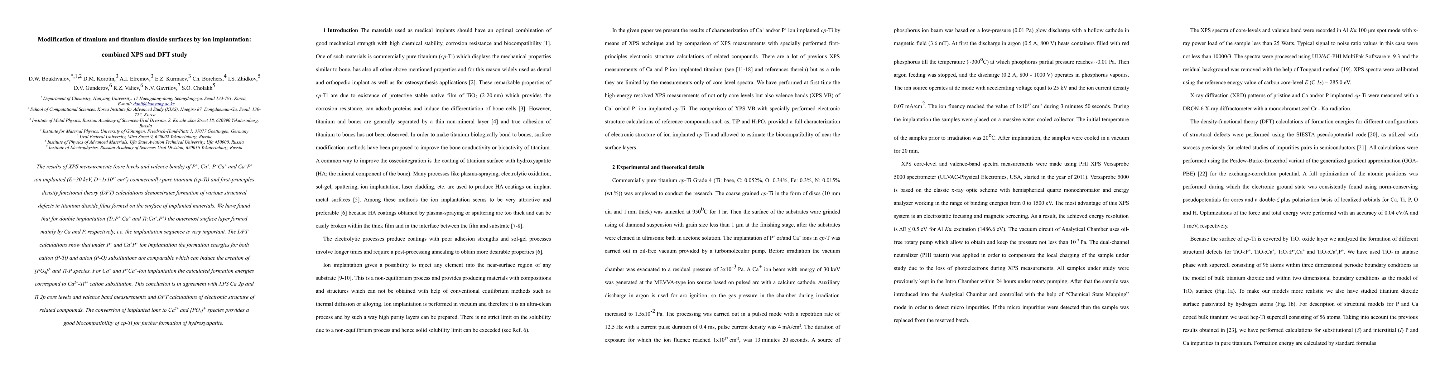 This study combines XPS measurements and DFT calculations to investigate the modification of titanium and titanium dioxide surfaces via ion implantation. The research reveals that the implantation sequence significantly affects the structural defects and the formation of Ca and P species, which enhances the biocompatibility of titanium for hydroxyapatite formation.