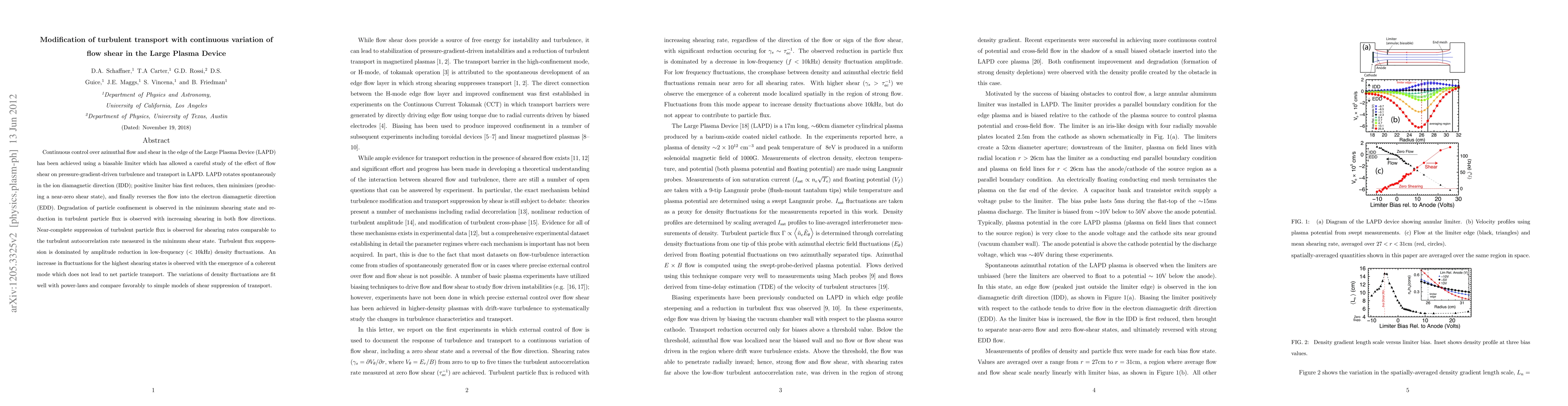 Continuous control over azimuthal flow and shear in the edge of the Large Plasma Device (LAPD) has been achieved using a biasable limiter which has allowed a careful study of the effect of flow shear on pressure-gradient-driven turbulence and transport in LAPD. LAPD rotates spontaneously in the ion diamagnetic direction (IDD); positive limiter bias first reduces, then minimizes (producing a near-zero shear state), and finally reverses the flow into the electron diamagnetic direction (EDD). Degradation of particle confinement is observed in the minimum shearing state and reduction in turbulent particle flux is observed with increasing shearing in both flow directions. Near-complete suppression of turbulent particle flux is observed for shearing rates comparable to the turbulent autocorrelation rate measured in the minimum shear state. Turbulent flux suppression is dominated by amplitude reduction in low-frequency ($<10$kHz) density fluctuations. An increase in fluctuations for the highest shearing states is observed with the emergence of a coherent mode which does not lead to net particle transport. The variations of density fluctuations are fit well with power-laws and compare favorably to simple models of shear suppression of transport.