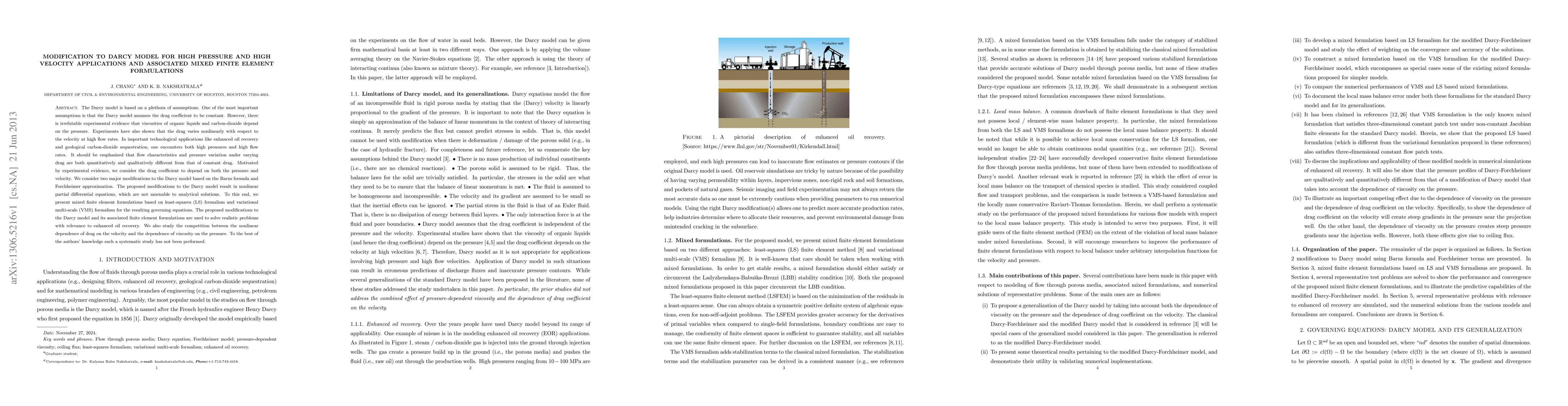 The Darcy model is based on a plethora of assumptions. One of the most important assumptions is that the Darcy model assumes the drag coefficient to be constant. However, there is irrefutable experimental evidence that viscosities of organic liquids and carbon-dioxide depend on the pressure. Experiments have also shown that the drag varies nonlinearly with respect to the velocity at high flow rates. In important technological applications like enhanced oil recovery and geological carbon-dioxide sequestration, one encounters both high pressures and high flow rates. It should be emphasized that flow characteristics and pressure variation under varying drag are both quantitatively and qualitatively different from that of constant drag. Motivated by experimental evidence, we consider the drag coefficient to depend on both the pressure and velocity. We consider two major modifications to the Darcy model based on the Barus formula and Forchheimer approximation. The proposed modifications to the Darcy model result in nonlinear partial differential equations, which are not amenable to analytical solutions. To this end, we present mixed finite element formulations based on least-squares formalism and variational multiscale formalism for the resulting governing equations. The proposed modifications to the Darcy model and its associated finite element formulations are used to solve realistic problems with relevance to enhanced oil recovery. We also study the competition between the nonlinear dependence of drag on the velocity and the dependence of viscosity on the pressure. To the best of the authors' knowledge such a systematic study has not been performed.