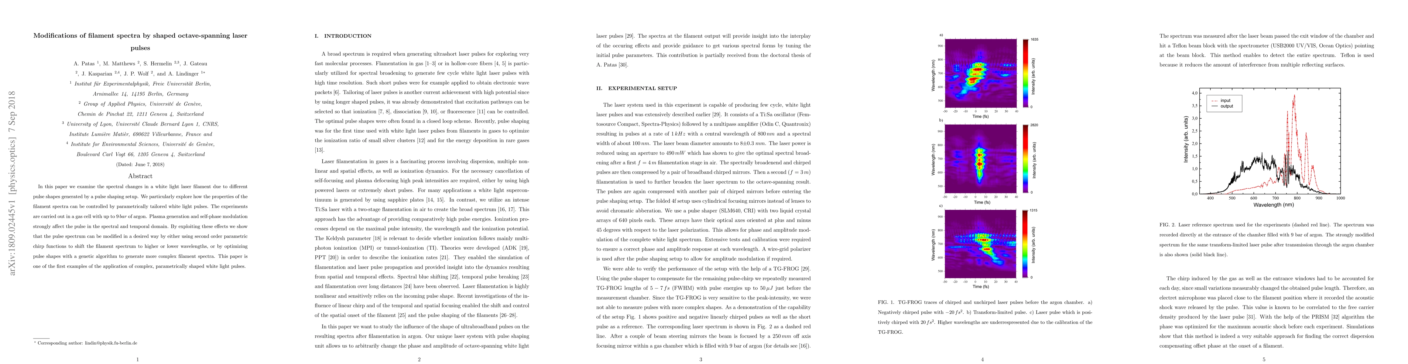 In this paper we examine the spectral changes in a white light laser filament due to different pulse shapes generated by a pulse shaping setup. We particularly explore how the properties of the filament spectra can be controlled by parametrically tailored white light pulses. The experiments are carried out in a gas cell with up to 9 bar of argon. Plasma generation and self-phase modulation strongly affect the pulse in the spectral and temporal domain. By exploiting these effects we show that the pulse spectrum can be modified in a desired way by either using second order parametric chirp functions to shift the filament spectrum to higher or lower wavelengths, or by optimizing pulse shapes with a genetic algorithm to generate more complex filament spectra. This paper is one of the first examples of the application of complex, parametrically shaped white light pulses.
