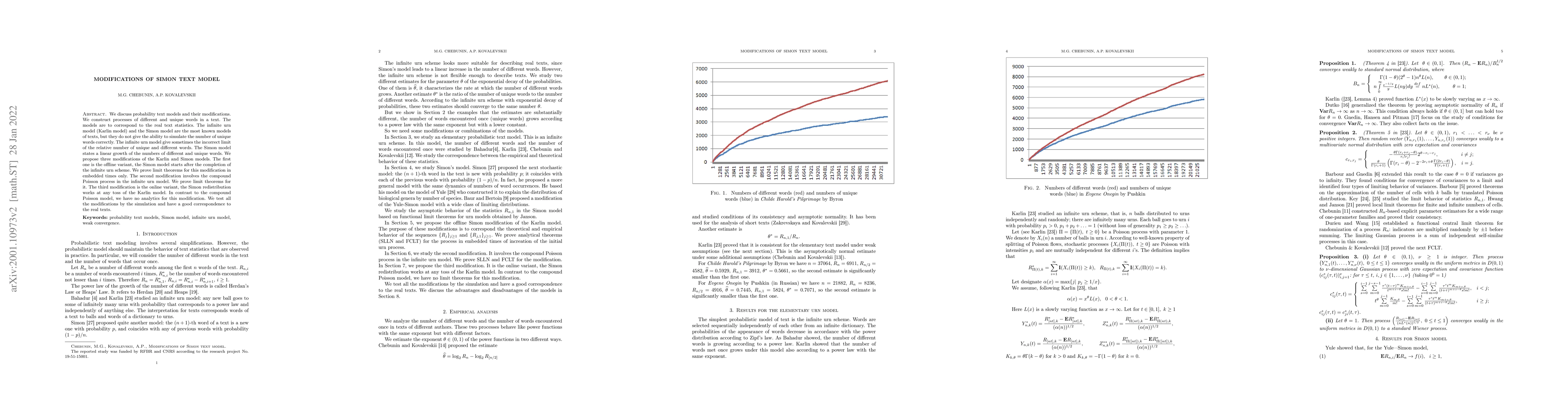 This paper proposes three modifications to the Karlin and Simon text models to better simulate the number of unique words in texts. The modifications include an offline variant, a compound Poisson process variant, and an online variant, each with corresponding limit theorems and simulation results showing improved correspondence to real text statistics.