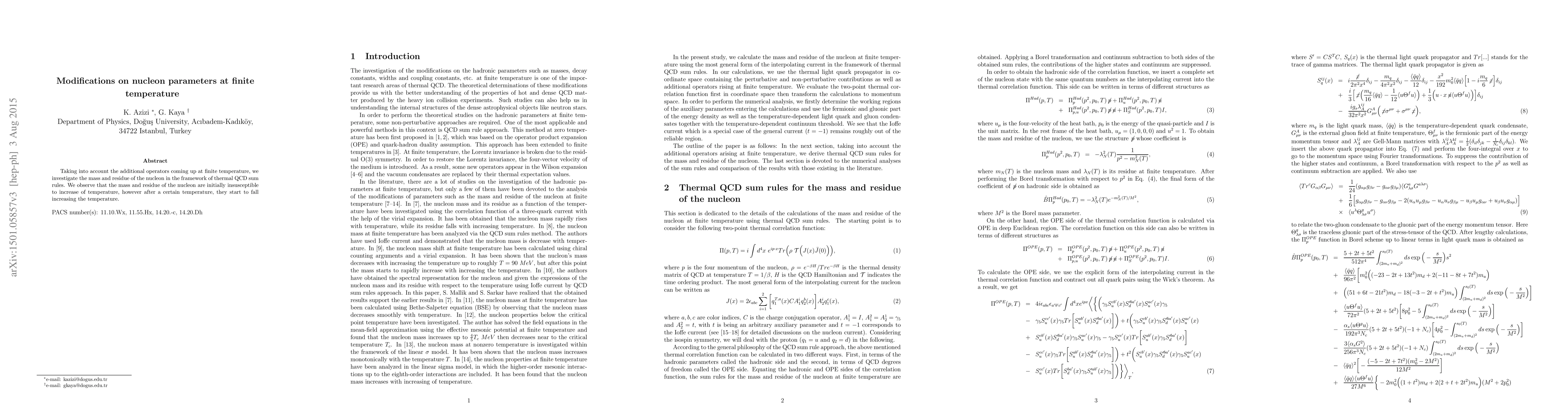 Taking into account the additional operators coming up at finite temperature, we investigate the mass and residue of the nucleon in the framework of thermal QCD sum rules. We observe that the mass and residue of the nucleon are initially insusceptible to increase of temperature, however after a certain temperature, they start to fall increasing the temperature.