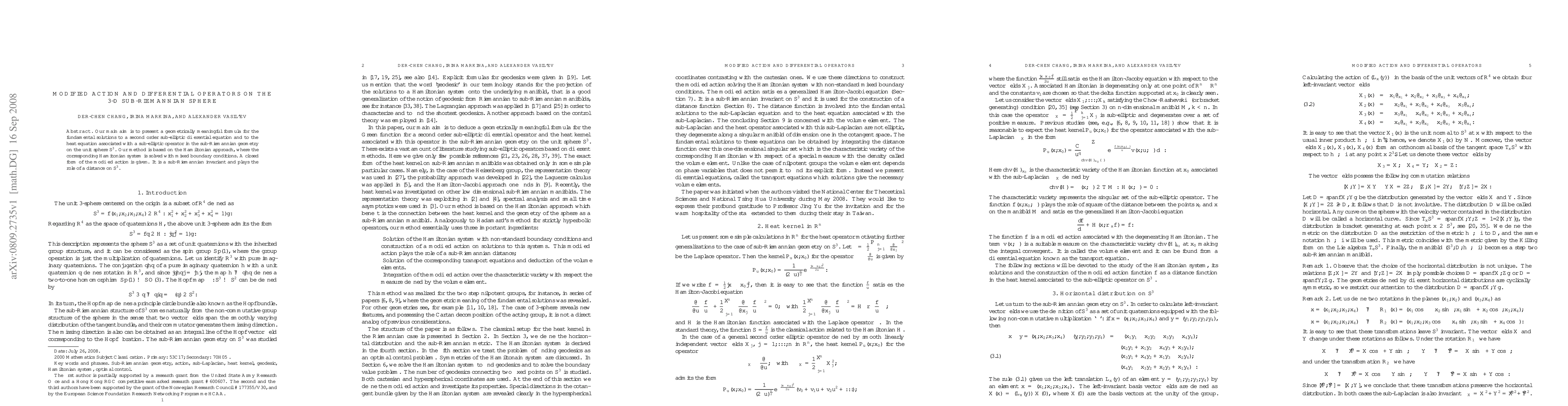 This paper presents a geometrically meaningful formula for the fundamental solutions to sub-elliptic differential equations on the 3-D sub-Riemannian sphere $\mathbb S^3$, using a Hamiltonian approach with mixed boundary conditions. It also introduces a closed form of a modified sub-Riemannian invariant action, which serves as a distance measure on $\mathbb S^3$.