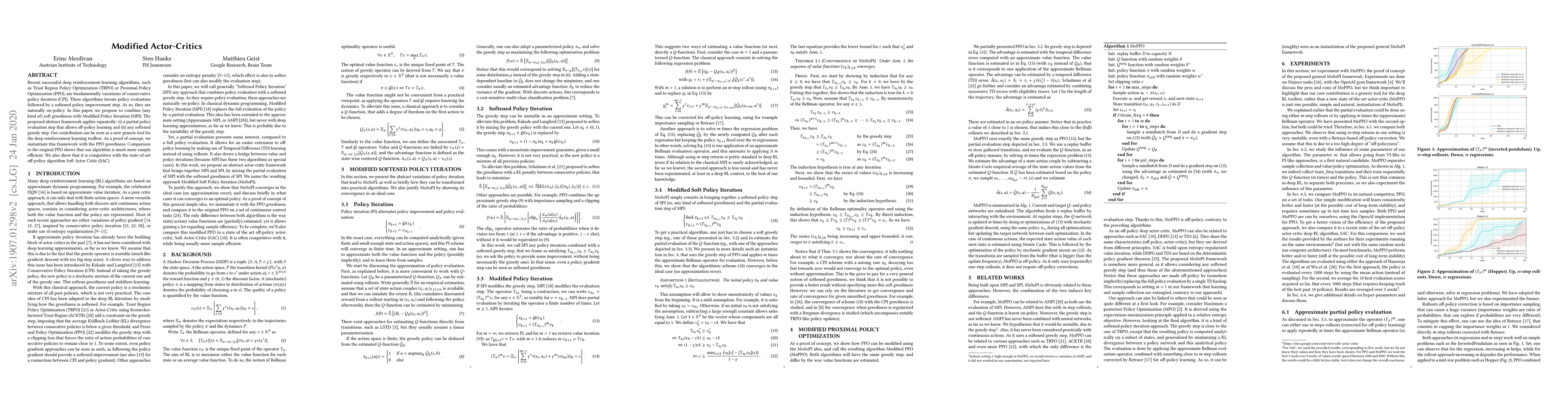 Recent successful deep reinforcement learning algorithms, such as Trust Region Policy Optimization (TRPO) or Proximal Policy Optimization (PPO), are fundamentally variations of conservative policy iteration (CPI). These algorithms iterate policy evaluation followed by a softened policy improvement step. As so, they are naturally on-policy. In this paper, we propose to combine (any kind of) soft greediness with Modified Policy Iteration (MPI). The proposed abstract framework applies repeatedly: (i) a partial policy evaluation step that allows off-policy learning and (ii) any softened greedy step. Our contribution can be seen as a new generic tool for the deep reinforcement learning toolbox. As a proof of concept, we instantiate this framework with the PPO greediness. Comparison to the original PPO shows that our algorithm is much more sample efficient. We also show that it is competitive with the state-of-art off-policy algorithm Soft Actor Critic (SAC).