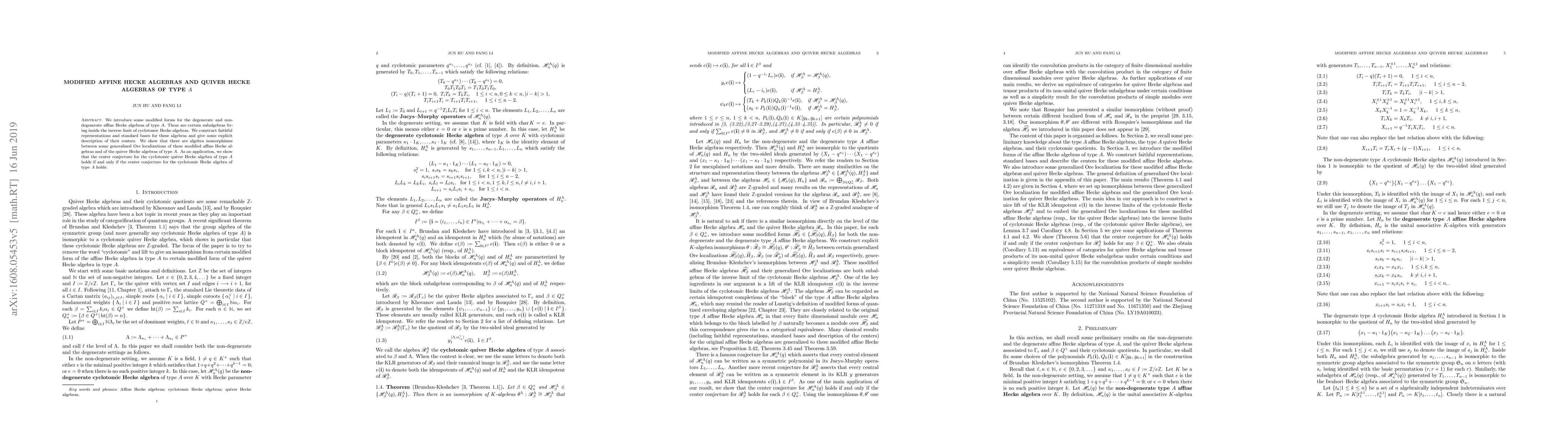 This paper introduces modified versions of affine Hecke algebras and quiver Hecke algebras of type $A$, establishing faithful representations and standard bases. It also proves isomorphisms between these modified algebras and quiver Hecke algebras, and applies these results to verify the center conjecture for cyclotomic quiver Hecke algebras.