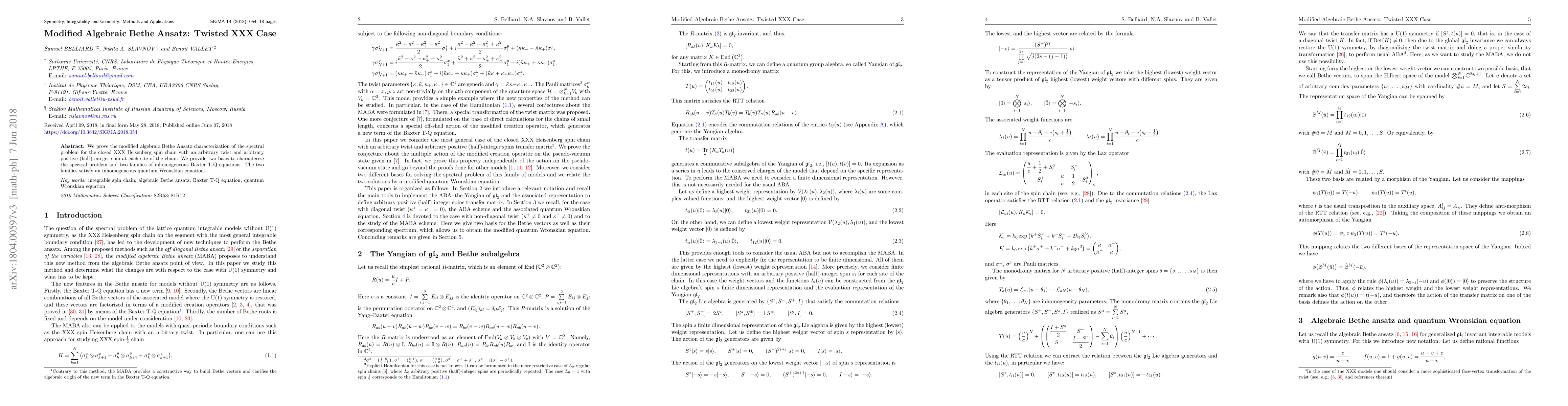 This paper establishes the modified algebraic Bethe Ansatz for the closed XXX Heisenberg spin chain with arbitrary twist and spin, introducing two bases and two families of Baxter T-Q equations that satisfy an inhomogeneous quantum Wronskian equation.