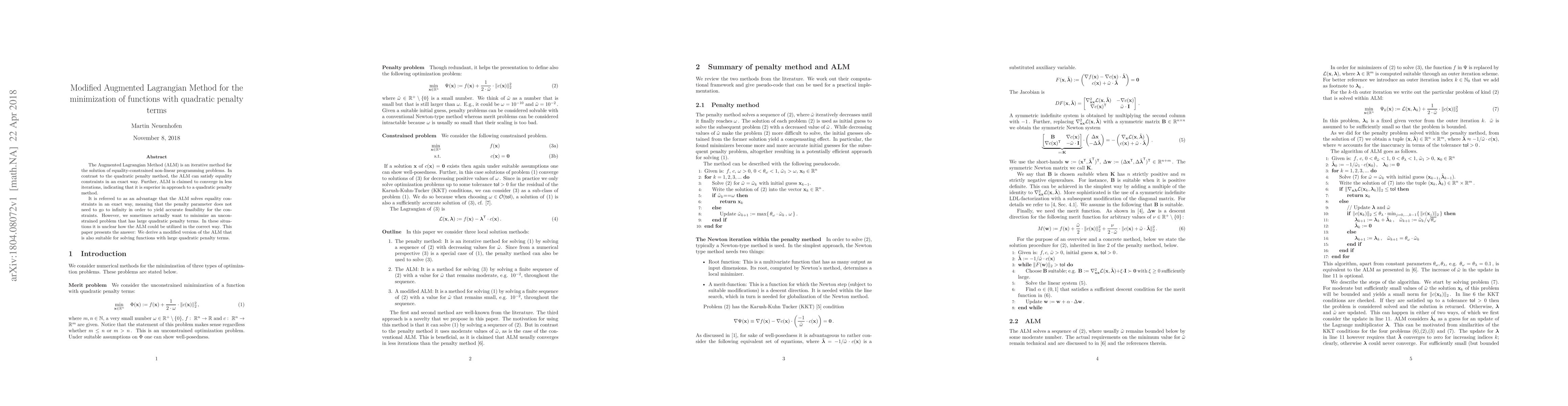 This paper proposes a modified version of the Augmented Lagrangian Method (ALM) to effectively minimize functions with large quadratic penalty terms, addressing the limitations of the traditional ALM in such scenarios. The modified ALM retains the benefits of exact constraint satisfaction while providing a practical approach for problems with significant penalty terms.
