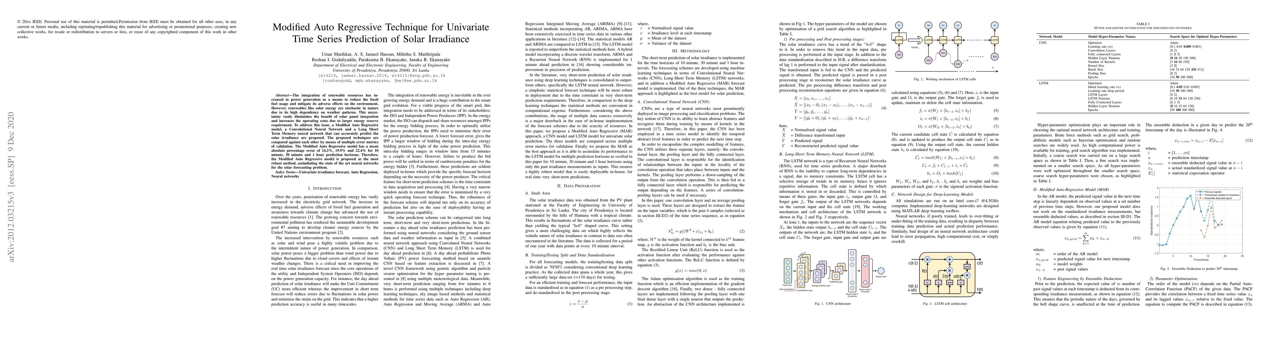 This paper proposes a Modified Auto Regressive model, along with Convolutional Neural Networks and Long Short Term Memory networks, to predict solar irradiance, addressing the stochastic nature of solar energy. The Modified Auto Regressive model emerges as the most robust method with mean absolute percentage errors of 14.2%, 19.9%, and 22.4% for 10, 30, and 60 minute forecasts respectively.
