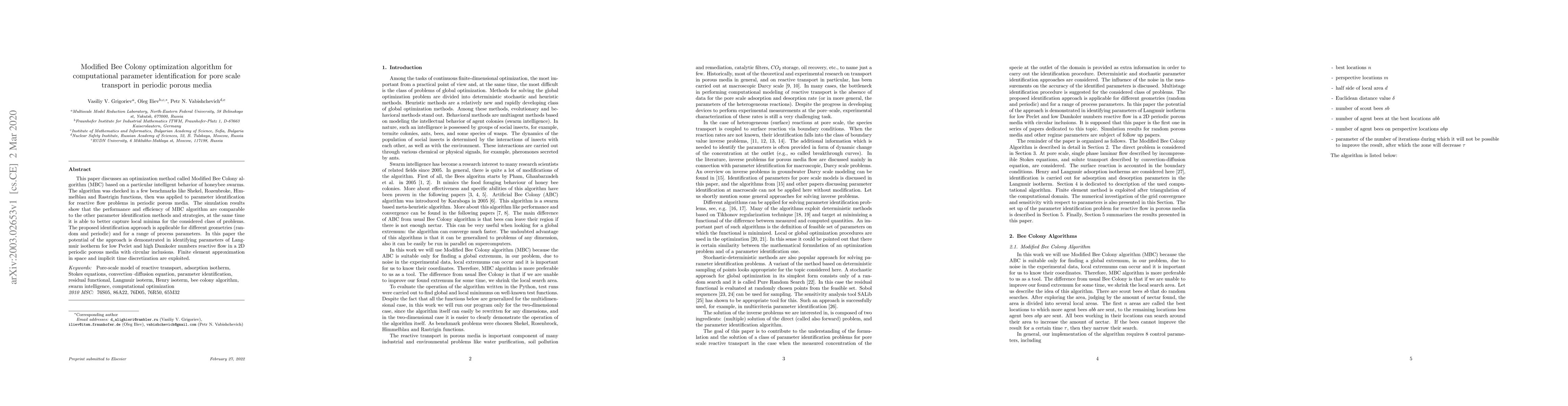 This paper proposes a Modified Bee Colony optimization algorithm (MBC) for identifying computational parameters in pore scale transport in periodic porous media. The MBC algorithm, inspired by honeybee behavior, effectively identifies parameters for reactive flow problems, demonstrating comparable performance and better local minima capture compared to other methods.