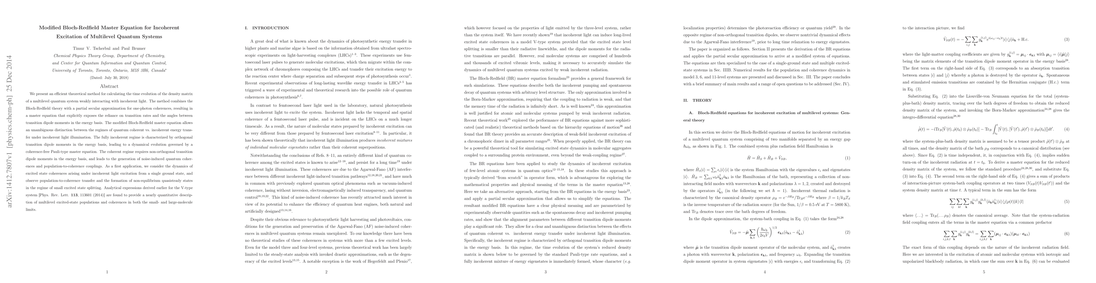 This paper proposes a modified Bloch-Redfield master equation to study the time evolution of a multilevel quantum system under incoherent light, distinguishing coherent from incoherent energy transfer regimes. The method highlights the role of transition rates and dipole angles, revealing population-to-coherence dynamics and quasisteady states.
