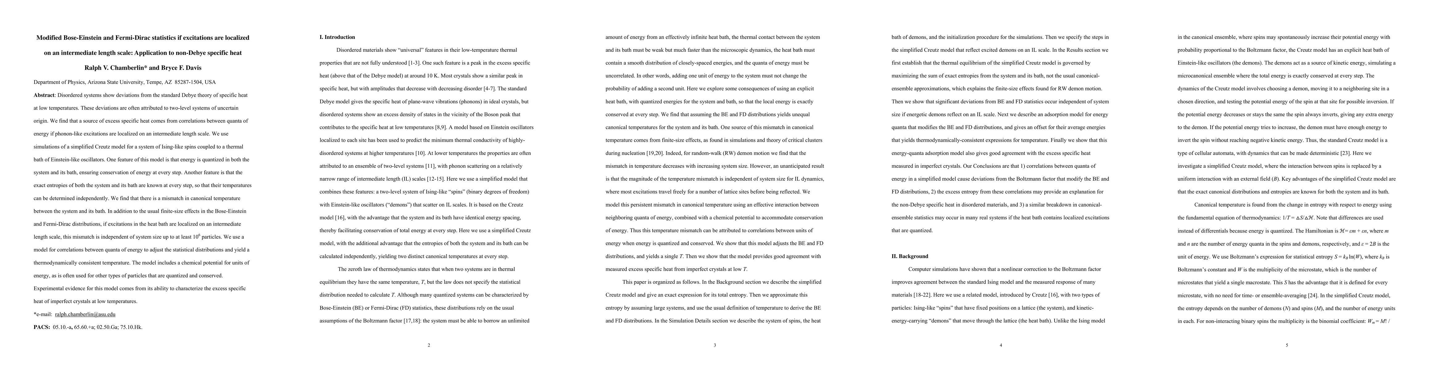 Disordered systems show deviations from the standard Debye theory of specific heat at low temperatures. These deviations are often attributed to two-level systems of uncertain origin. We find that a source of excess specific heat comes from correlations between quanta of energy if phonon-like excitations are localized on an intermediate length scale. We use simulations of a simplified Creutz model for a system of Ising-like spins coupled to a thermal bath of Einstein-like oscillators. One feature of this model is that energy is quantized in both the system and its bath, ensuring conservation of energy at every step. Another feature is that the exact entropies of both the system and its bath are known at every step, so that their temperatures can be determined independently. We find that there is a mismatch in canonical temperature between the system and its bath. In addition to the usual finite-size effects in the Bose-Einstein and Fermi-Dirac distributions, if excitations in the heat bath are localized on an intermediate length scale, this mismatch is independent of system size up to at least 10^6 particles. We use a model for correlations between quanta of energy to adjust the statistical distributions and yield a thermodynamically consistent temperature. The model includes a chemical potential for units of energy, as is often used for other types of particles that are quantized and conserved. Experimental evidence for this model comes from its ability to characterize the excess specific heat of imperfect crystals at low temperatures.