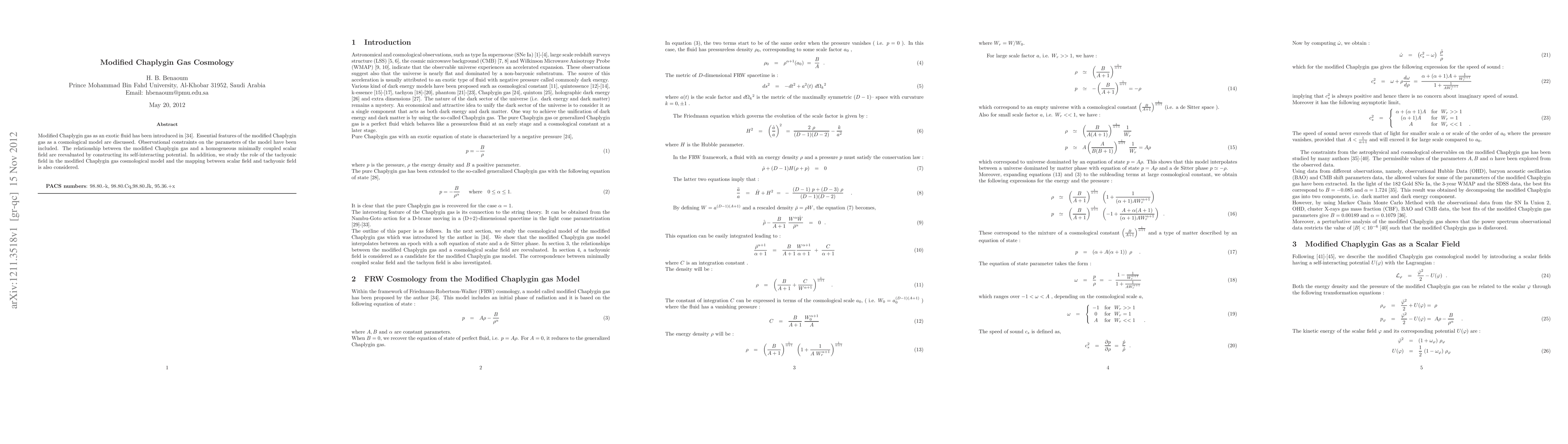 This paper explores the modified Chaplygin gas as an exotic cosmological fluid, discussing its observational constraints and comparing it to a minimally coupled scalar field through a self-interacting potential. It also investigates the role of a tachyonic field within this model and examines the mapping between scalar and tachyonic fields.