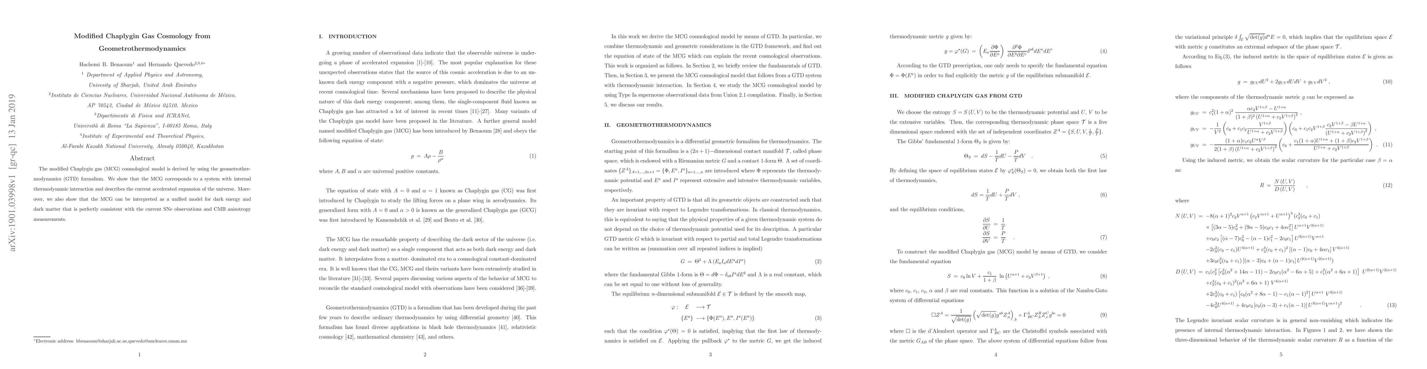 This paper derives the modified Chaplygin gas cosmological model using geometrothermodynamics, demonstrating its consistency with current accelerated expansion observations and its potential to unify dark energy and dark matter. The model aligns with supernovae and cosmic microwave background data.