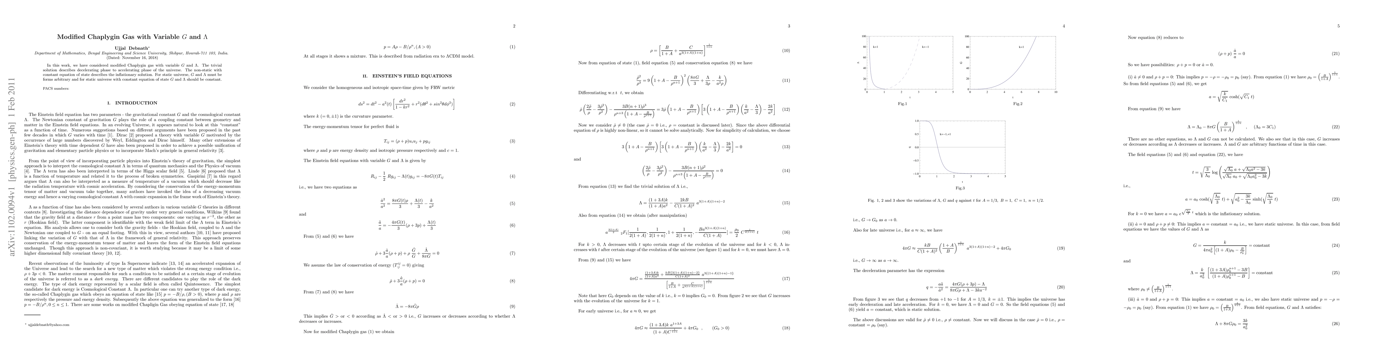 The paper presents detailed derivations of equations governing the modified Chaplygin gas model with variable G and $\Lambda$, providing expressions for $\rho$, $\Lambda$, and $G$ as functions of scale factor $a$.