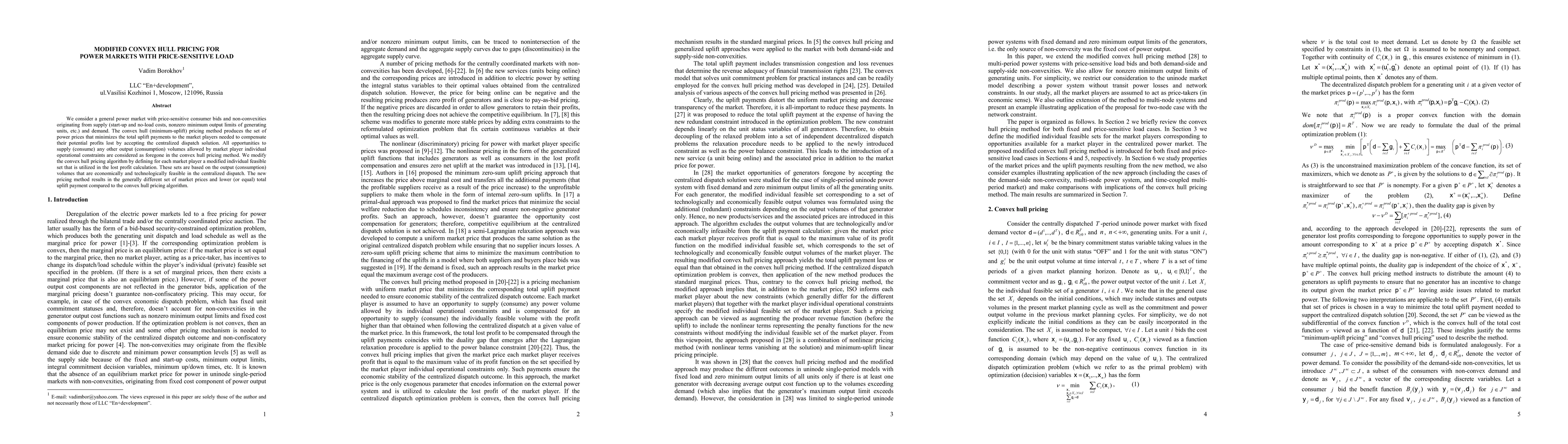 This research modifies the convex hull pricing method for power markets with price-sensitive load, introducing a new feasible set for each market player that considers economically and technologically feasible output and consumption volumes, leading to different market prices and potentially lower total uplift payments.