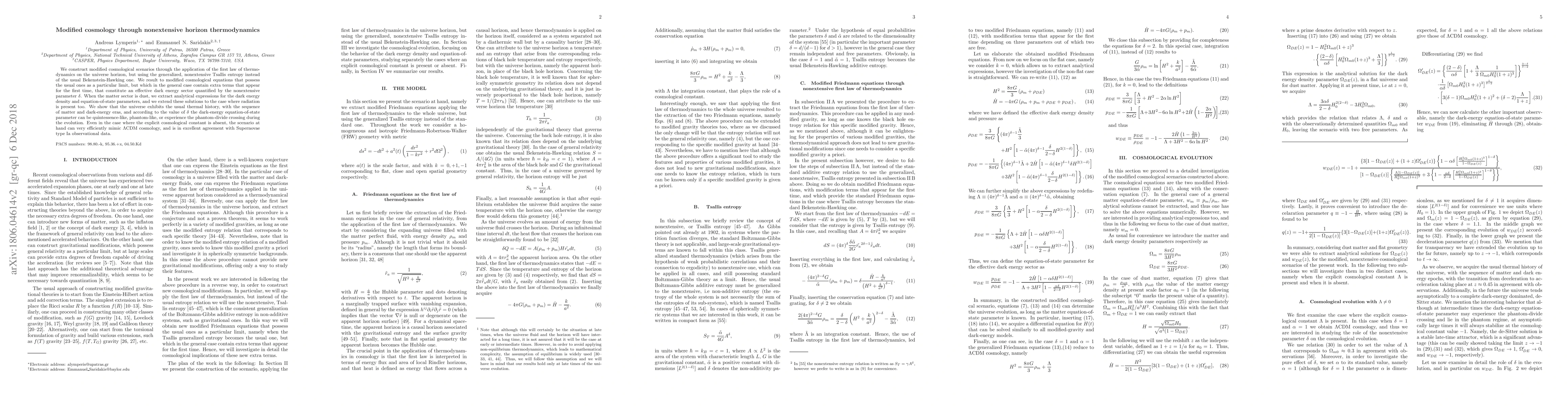 Researchers developed a modified cosmology framework using nonextensive horizon thermodynamics, revealing potential quintessence-like, phantom-like, or crossing dark energy behaviors, mimicking LambdaCDM cosmology with high accuracy.