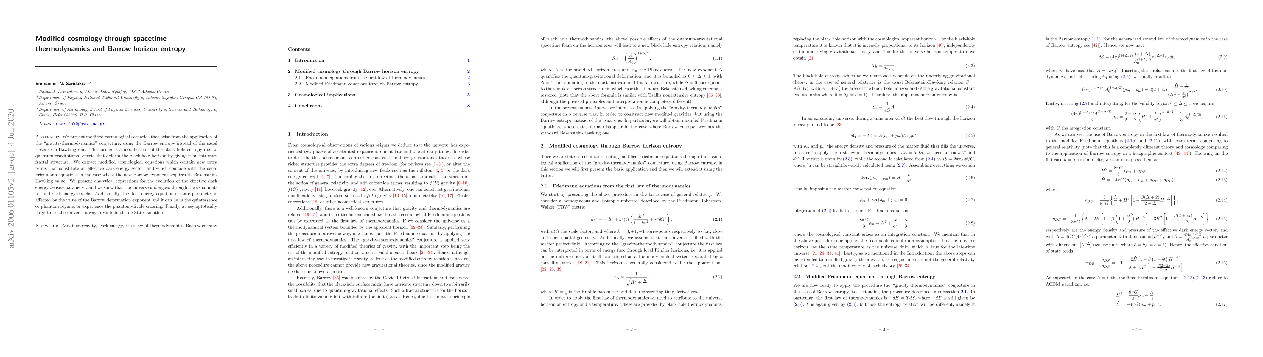 This paper explores modified cosmological models using the "gravity-thermodynamics" conjecture with Barrow entropy, revealing new terms in the Friedmann equations that represent an effective dark-energy sector. The study shows the universe's evolution through matter and dark-energy epochs, with the dark-energy equation-of-state parameter potentially crossing the phantom divide.